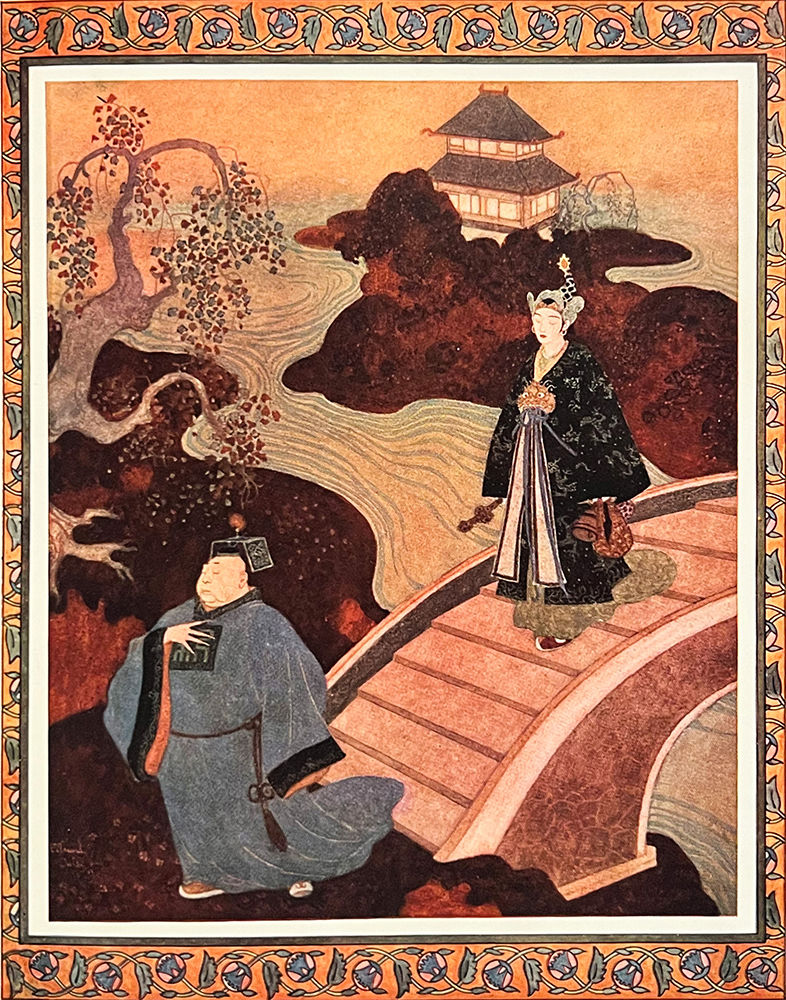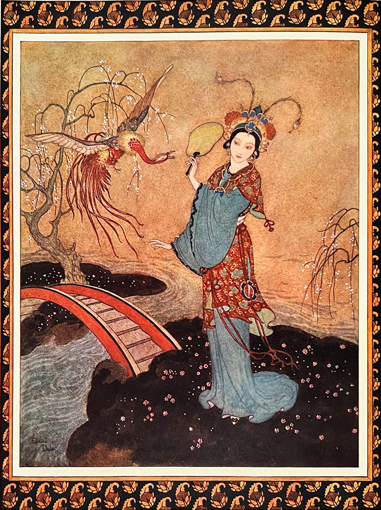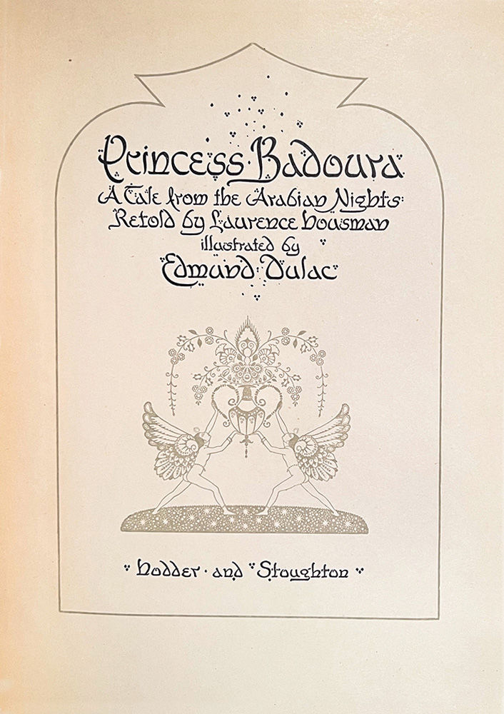 Laurence Housman’s short story, Princess Badoura: A Tale from the Arabian Nights (1913), was inspired by an episode in the folktale collection “One Thousand and One Nights". Dulac’s illustrations for this volume are somewhat of a departure from his Persianate-miniature inspired style, drawing instead on Chinese painting. After some magical intervention by two Genies the beautiful Chinese Princess and the Prince Persia fall in love—the story recounts their adventures as they attempt to be together. A contemporary review from the Outlook described Dulac’s illustrations thusly “Nothing more purely beautiful has ever come even from Dulac’s fairy brush than the picture of Badoura in the arms of Camaralzaman against a background so exquisite as to make one hold one’s breath” (Hughly).