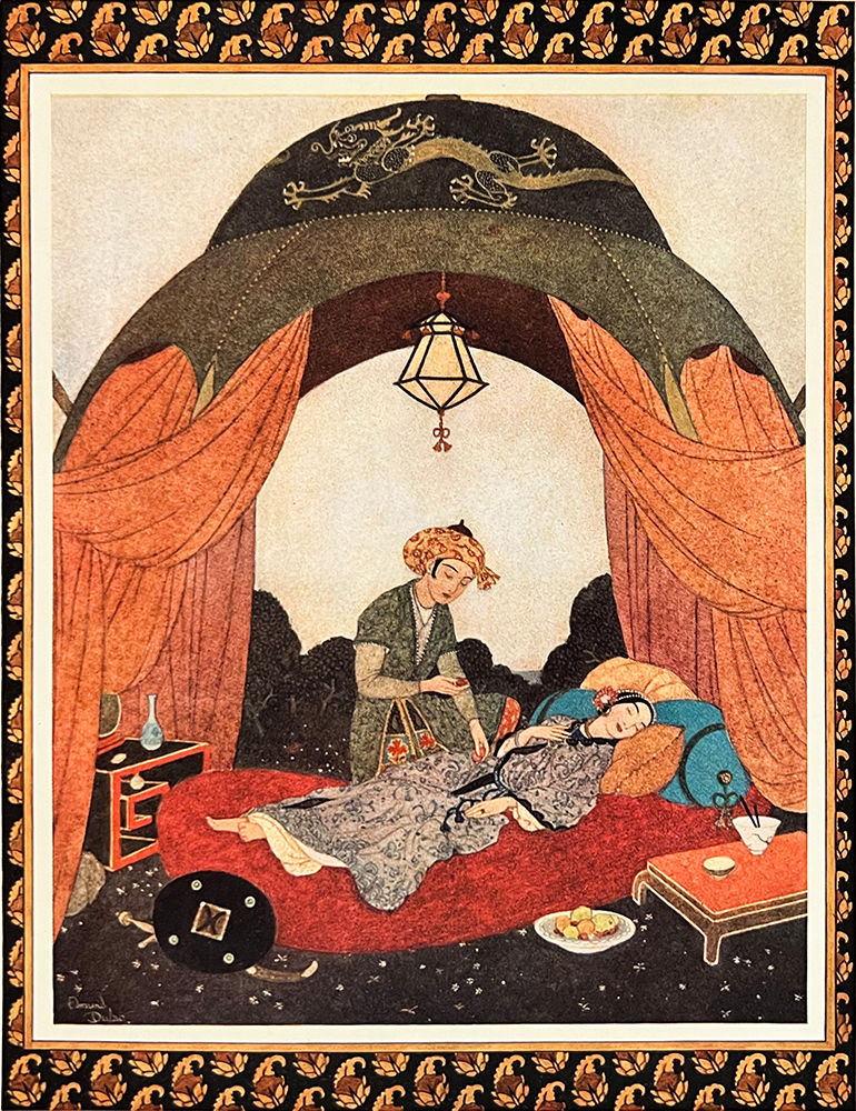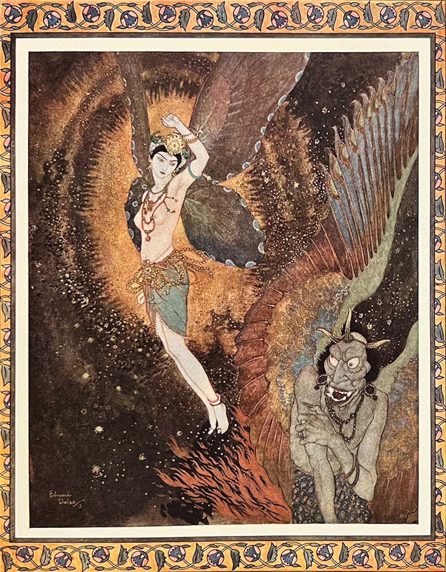 French-born anglophile Edmond Dulac (1882-1953) was one of the most prized artists of the “golden age” of book illustration. A gifted artist, especially in the medium of watercolor, Dulac’s ability to render luxurious detail and subtle emotions is otherworldly. He is best known for his illustrations for books and magazines, although he also designed for the stage and wrote music; in moments of financial insecurity he produced serialized cartoons and became an authority on postage stamp design (White).