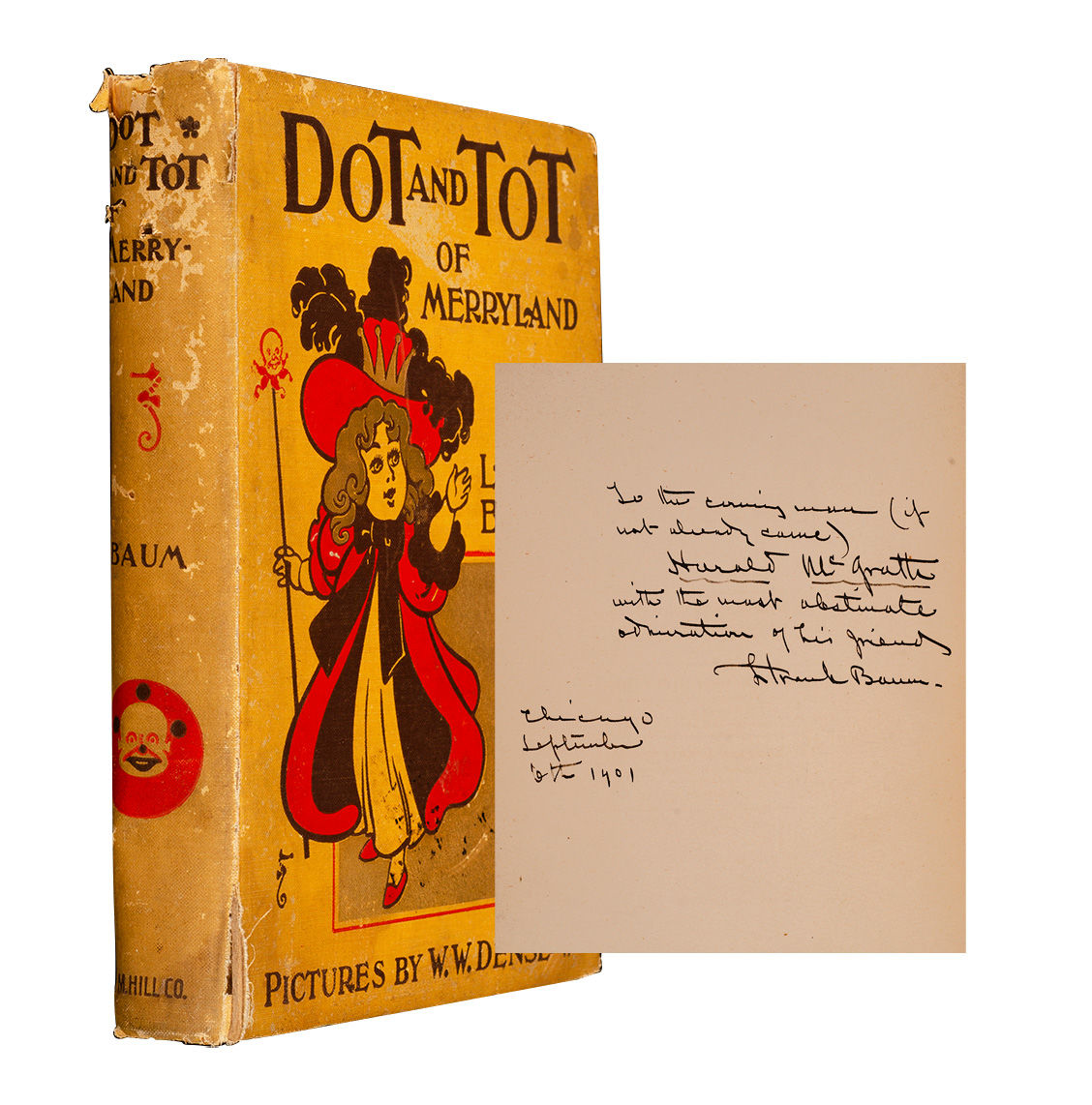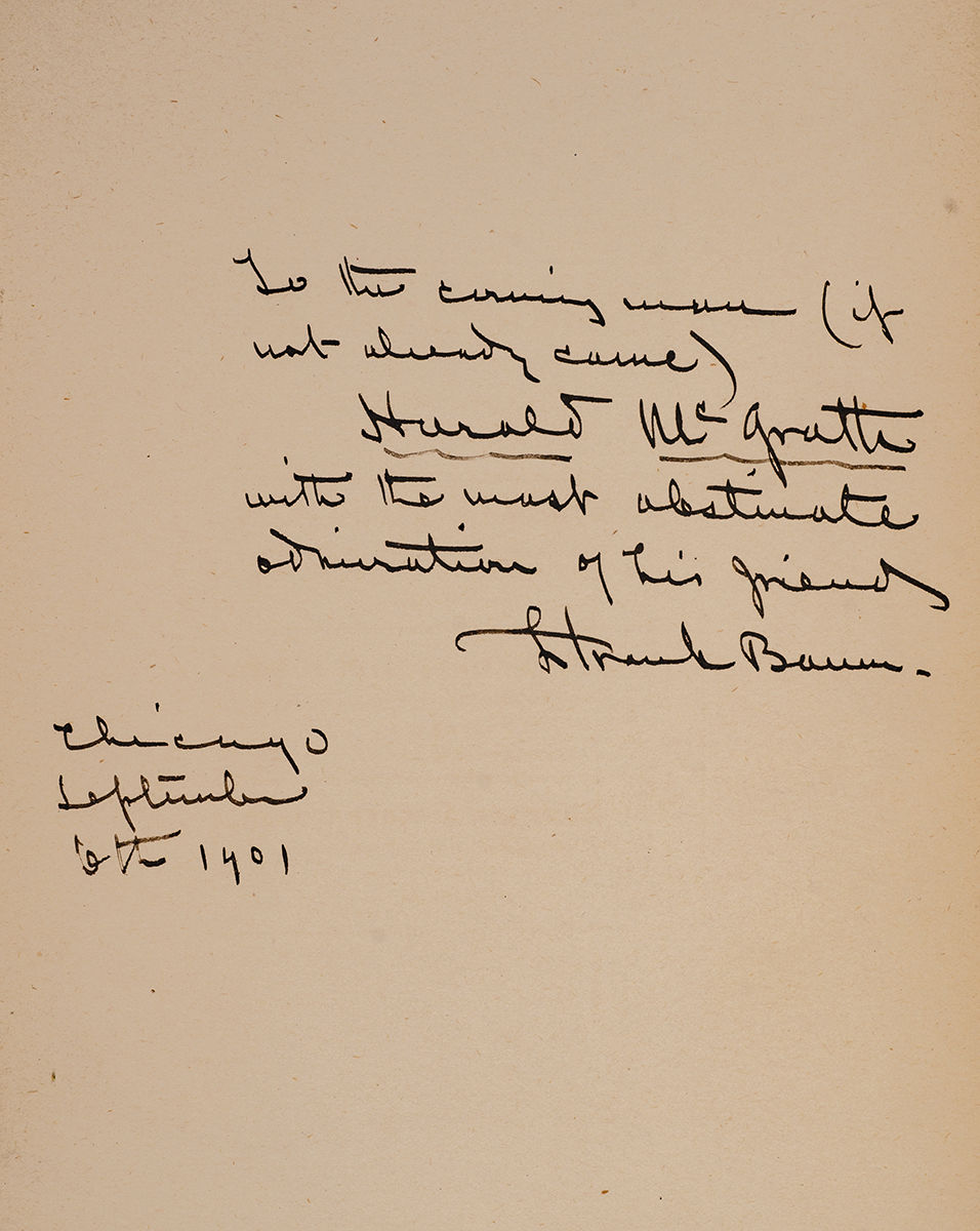 Chicago: Geo. M. Hill Co, 1901. First edition. Fine. Small quarto (8 5/16 x 6 3/8 inches; 211 x 162 mm.). [viii], [13]-225, [226], [2, blank] pp. Inscribed on recto of advertisement leaf "To the coming man if / not already came) / Harold McGrath / with the most obstinate / admiration of his friend / L Frank Baum. / Chicago / September / 6th 1901". Publisher's pictorial tan cloth. Front cover pictorially decorated in red, black and gilt, rear cover pictorially decorated in red and black, spine decorated in red and black. Original pictorial endpapers in red, black and tan, front free endpaper chipped at edge. The front hinge and the spine extremities and corners have been expertly restored. Affixed to the verso of the front free endpaper is a folded page of the original manuscript containing the first twenty lines of page 196. Housed in a felt-lined quarter black morocco over black cloth clamshell case, spine with five raised bands decoratively ruled and lettered in gilt in compartments. A fantastic presentation copy to a fellow major author where L. Frank Baum has included a fine page of his original manuscript.
