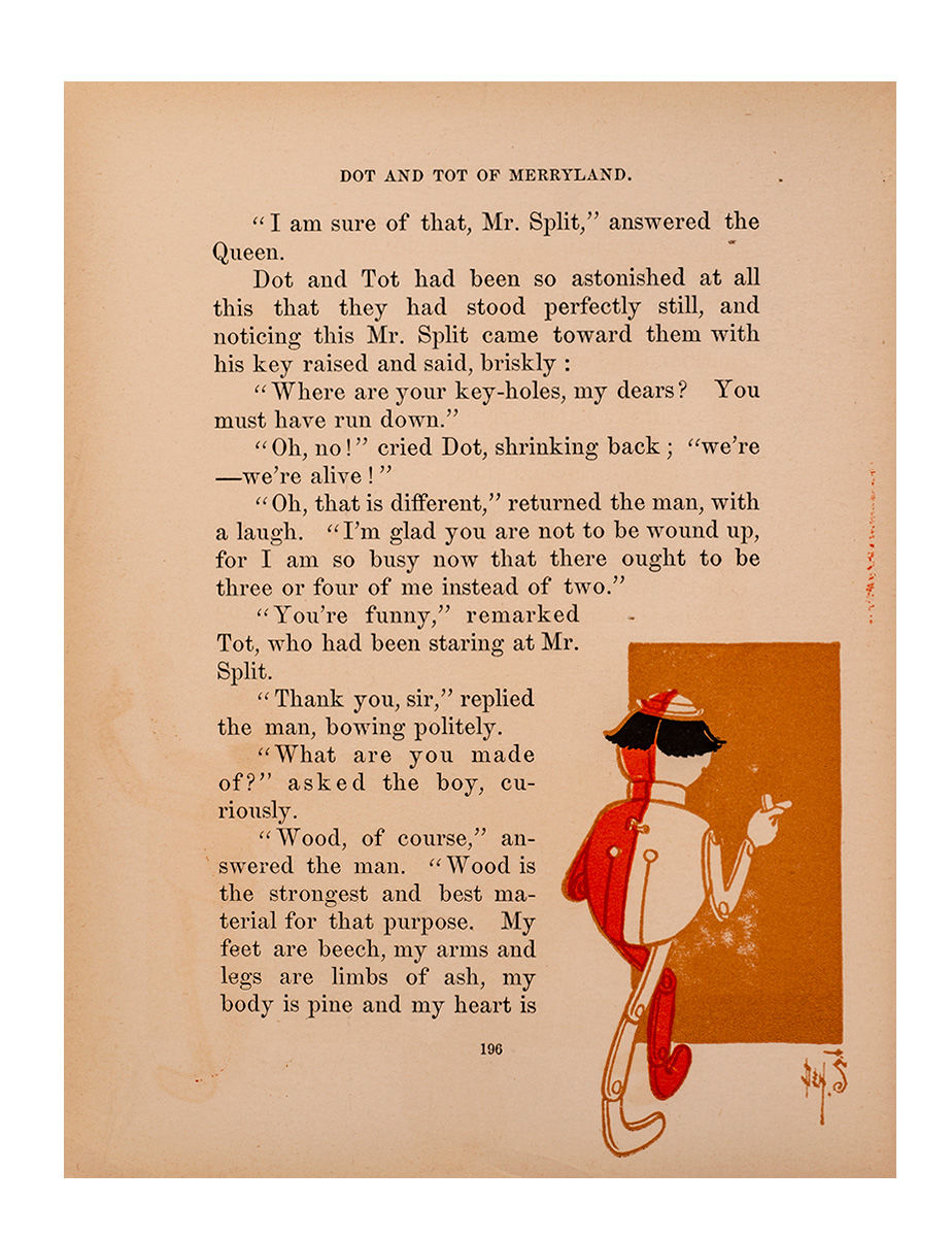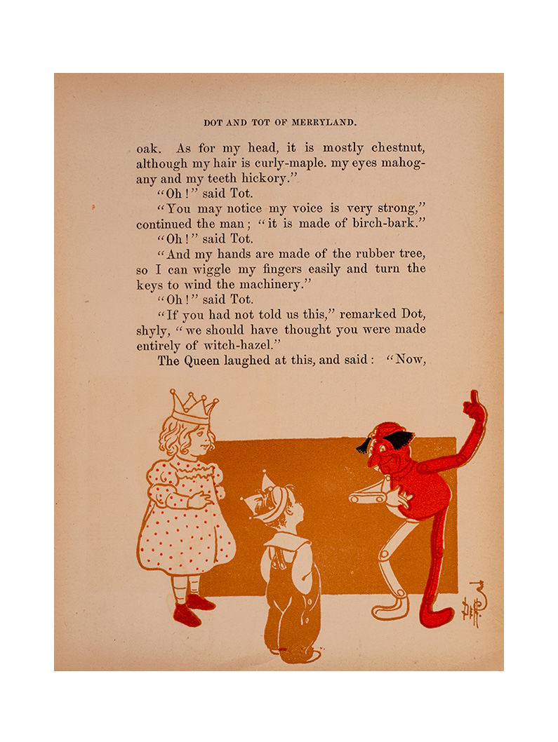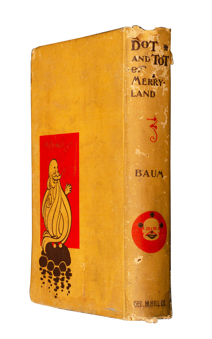 Dot and Tot of Merryland was written after Baum wrote The Wonderful Wizard of Oz. The story follows the adventures of a little girl named Evangeline "Dot" Freeland after she is sent to her rich father's country estate Roselawn to improve her health. She befriends gardener's son "Tot" Thompson, and the two are accidental transported to the magical country of Merryland. Merryland is made of seven valleys, arranged in a circular pattern connected by a river running through them, and each valley is populated by different magical beings (cats, dolls, candy, etc). Unlike The Wonderful Wizard of Oz, Dot and Tot of Merryland contained no tipped in color plates, but was filled with colored text illustrations, including four full page pictures, all by W. W. Denslow who had illustrated the three previous Baum books.
