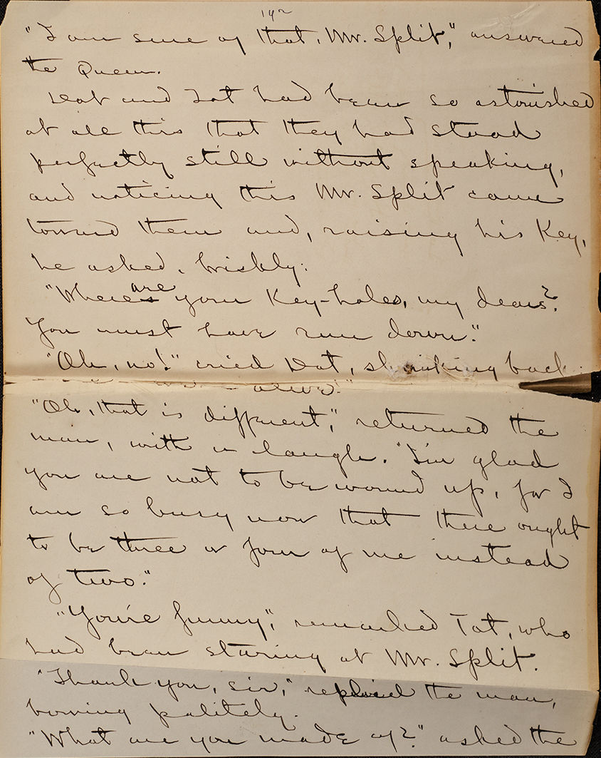 Dot and Tot had been so astonished / at all this that they had stood / perfectly still[without speaking,] / and (without) noticing this Mr. Split came / toward them [and,](with his key raised) raising his key, / (and said) he asked, briskly: /