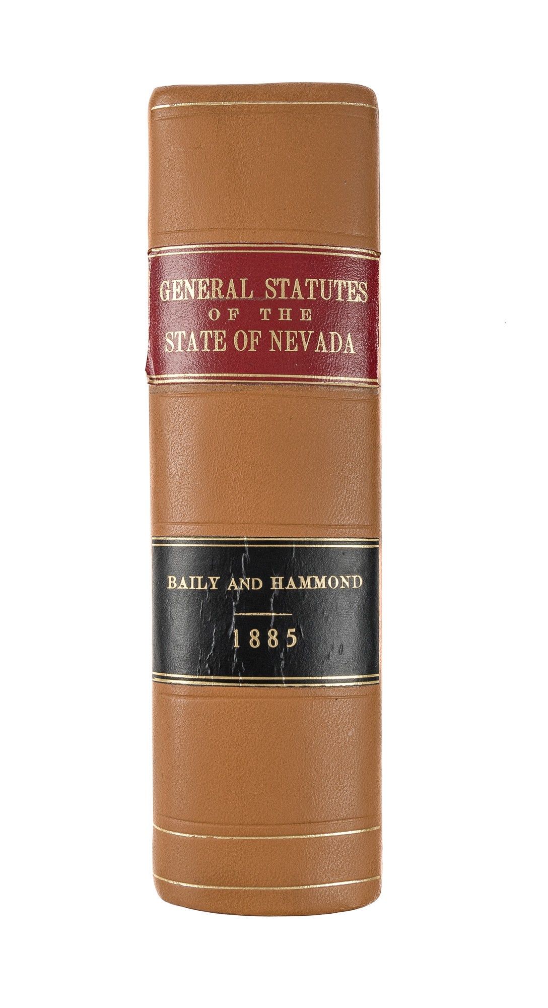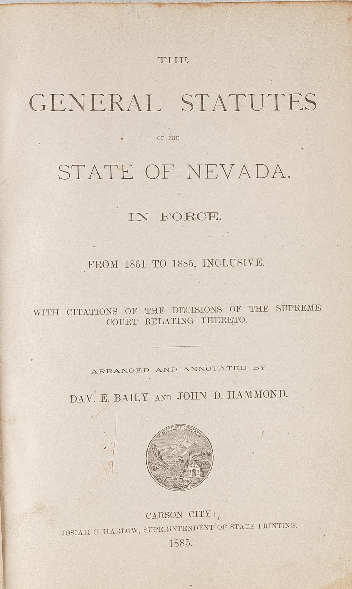 1885. Carson City, [Nevada]: J.C. Harlow, 1885.. Carson City, [Nevada]: J.C. Harlow, 1885. Baily, Dav. E. Hammond, John D. The General Statutes of the State of Nevada: In Force. From 1861 to 1885, Inclusive. With Citations of the Decisions of the Supreme Court Relating Thereto. Arranged and Annotated by Dav. E. Baily and John D. Hammond. Carson City, [Nevada]: J.C. Harlow, Superintendent of State Printing, 1885. viii, 1308 pp. Modern tan calf, retaining original red and black gilt lettering pieces. Endpapers renewed. A very good copy. $250. * Table of Contents. Preliminary: Naturalization; Authentication of Records; Grants of Land to the State of Nevada; Election of United States Senators; Constitution of the State of Nevada; Index to the Constitution. General Statutes: Mines and Mining; Public Lands and Agriculture; Roads and Bridges; Domestic Relations; Military Affairs; Domestic Animals; Wild Game and Fish; Corportaions; Revenue and Taxes; Public Schools; State Institutions; Elections; Officers Generally; State Officers; County and Township Officers; Courts of Justice; Rela Property and Conveyances; Estates of Deceased Persons; Proceedings in Civil Cases; Crimes and Punishments; Certain Miscellaneous Enactments; Appendix: Titles of Certain Statutes Not of General Importance.