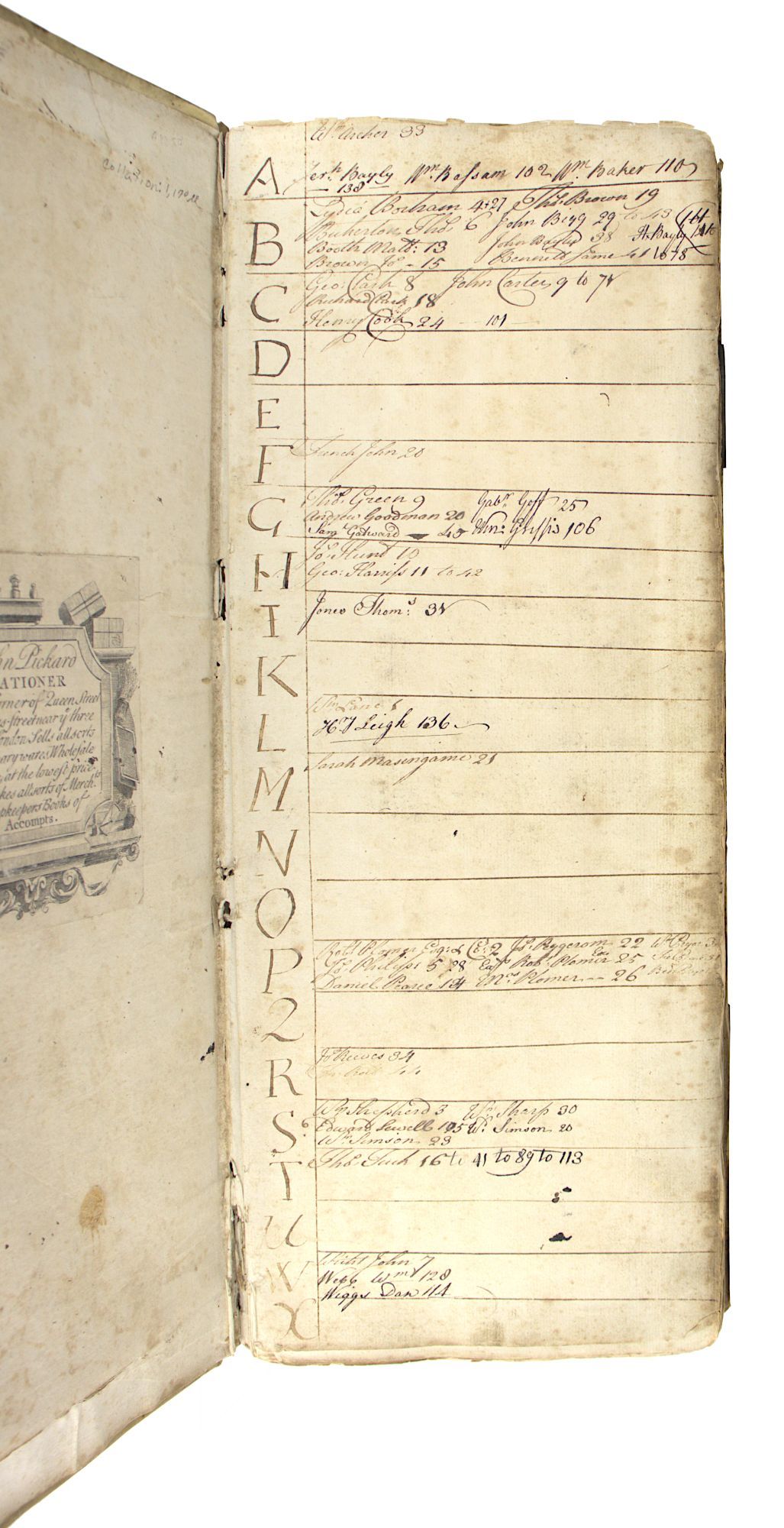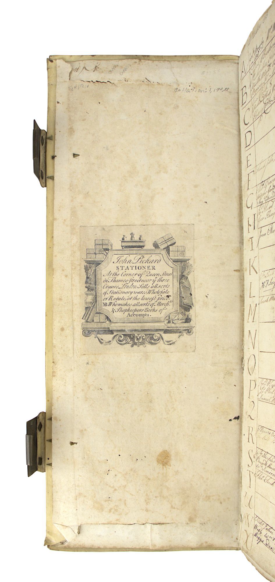 Retains original pictorial engraved stationer's label on front pastedown: "John Pickard / Stationer / At the Corner of Queen Street in Thames-street near ye three Cranes London Sells all sorts of Stationery wares. Wholesale or Retale [sic], at the lowest price. NB Who makes all sorts of Merchts. & Shopkeepers Books of Accompts."