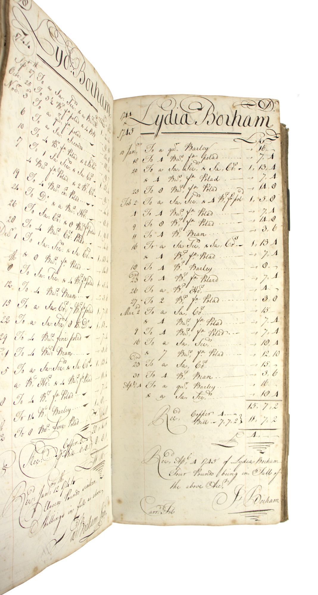 Minutely-kept accounts ledger of London-area farmer John Borham Jr. The monotony of selling flour, bran, and malt to the same handful of customers is occasionally broken up by the sale of a a quarter, half, or whole "fat beast" and the occasional dead horse. Services are also (infrequently) rendered, such as the renting of a meadow or the keeping of a cow for 12 weeks. The names of the same customers crop up regularly, one of the most frequent being Lydia Borham (perhaps a close relation of farmer John's?), who over the course of nearly a decade appears in these pages several once or twice a week, cropping up thirty-eight pages of accounts. In comparison, her only other female compatriot present here, Sarah Masingame, only wracked up eight and a half pages of accounts.