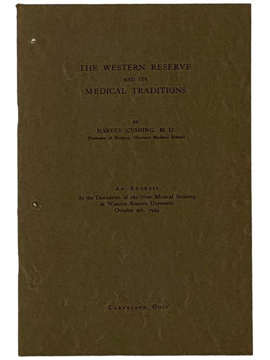 Cleveland, Ohio: S.N, 1924. Stapled Binding. Near Fine. Two small holes in wrappers. 1924 Stapled Binding. 33, [3] pp. A transcript of an address given at the dedication of the new medical building of Western Reserve University on October 9th, 1924, by the first exclusive neurosurgeon, who wrote a multi-volume biography of William Osler.