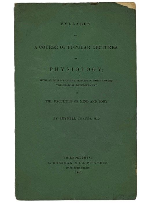 Philadelphia: C. Sherman & Co., Printers, 1840. First Edition. Soft Cover. Good. First edition. Loss to spine, chips and tears to wrapper edges. 1840 Soft Cover. 23, [1] pp. Green wrappers, black titles, sewn binding. Hoolihan 683: "Coates provides the outlines of twelve lectures intended 'to diffuse as widely as possible throughout the community a knowledge of certain general principles connected with the development of the animal frame, with the applicability of these principles to the every-day business of life, the promotion of health and happiness'. In printed wrapper.