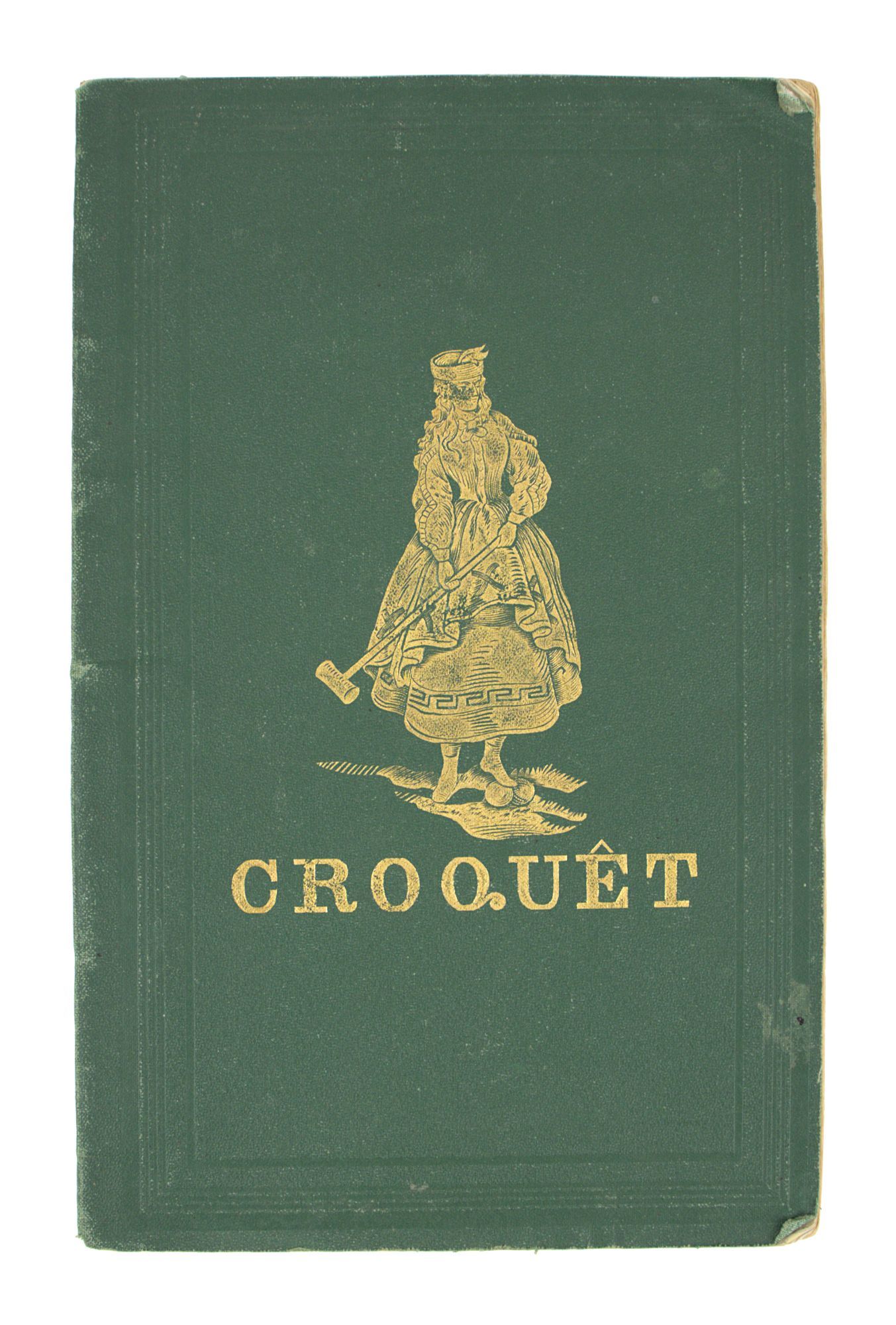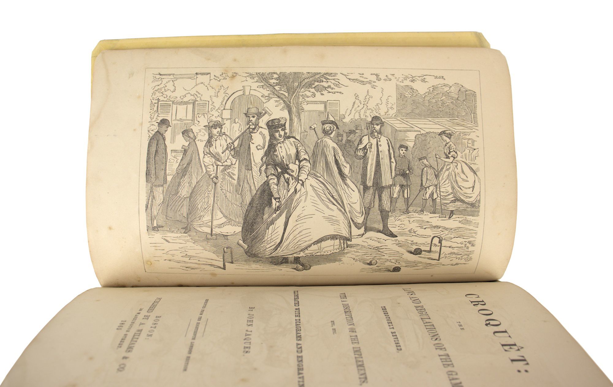 Early croquet manual exported for an American audience, the game having been first entered public record just a decade earlier in England. The intended audience was certainly women and children, the upper cover adorned with a finely-dressed young woman with croquet mallet, her left foot keeping two croquet balls in place. A similar figure dominates the crowded frontispiece as well. Local advertisements bound in rear for croquet equipment from D.O. Goodrich of Boston, and Whipple & Smith of Salem, Mass., who had begun production just the year before, in 1864.