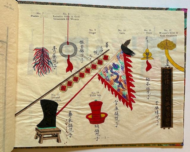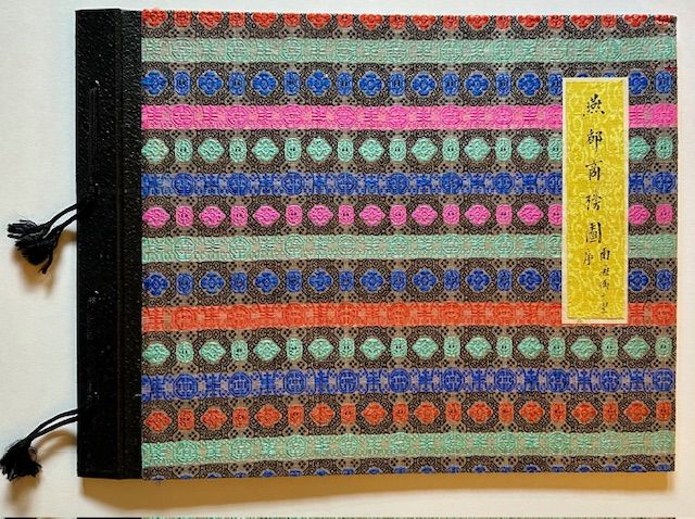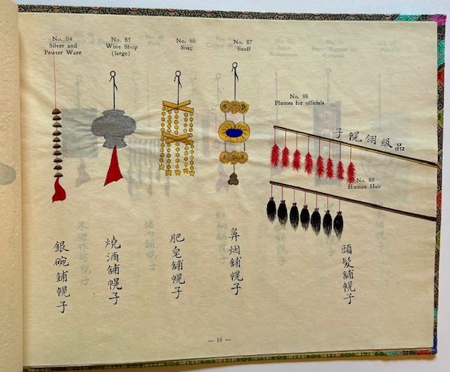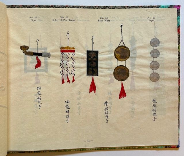 Peking, China: Chinese Painting Association of Peking, 1931. Decorative Boards. Near Fine. A lovely copy of the October 1931 1st edition, limited to 100 unnumbered copies. Clean and Near Fine in the publisher's patterned, multi-colored ribbon boards, backed by a dark, string-tied leatherette spine. With 101 fine hand-colored illustrations on 18 sheer leaves, the oblong album measures 13 1/2" in width x 10 1/4" in height. The wonderful illustrations depict the specific shop signs (most of them designed to hang over front entrances), including public baths, saddlers, ginger, dairy, toilet sets, lamp wicks, horse tassels, drums, sesame oil, yellow rice, macaroni, swords, portrait painter, felt caps, whips, midwifery, soles for men's shoes, lanterns, cotton, glass toys, pipes, paper, hats, candles, cross bows, horse hair, eye medicines, tobacco, betel nut, snuff, plumes for officials, human hair, paper figures for funerals, bamboo shoots, cooking steamers, etc. In each case the hues are vivid and dramatic, the execution of the painting first-rate. Following the title page is an Oct. 1st 1931 Preface by H.K. Fung, Ph.D. along the recto and then, at the next recto, the Table of Contents. A striking example of early 20th century Chinese market life.