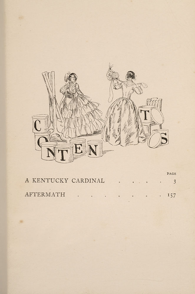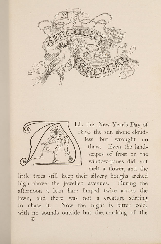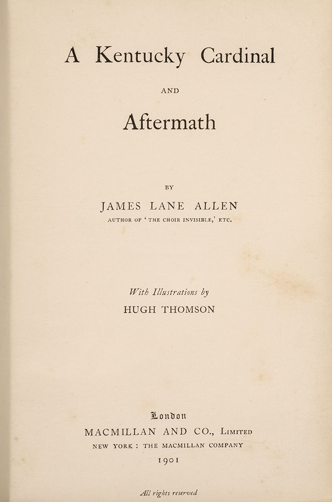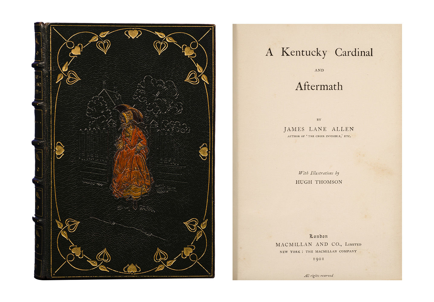 A Kentucky Cardinal, and Aftermath is an antebellum romance spread over two novels written by James Lane Allen (1895–96). The books recount the story of the nature-loving naturalist Adam Moss who falls for Georgianna, a high society girl. The first book follows their courtship and the second their marriage. Allen’s richly descriptive text is certainly influence by his youth spent in Kentucky. Here the book is brought to life through illustration and design.The artist, Hugh Thomson (1860-1920), was most famous for his illustrations of Austen’s work, as well as the work of Charles Dickens. Known for his attention to detail, he would often spend a great deal of time in museums researching the lifestyles and dress of the characters he was depicting.