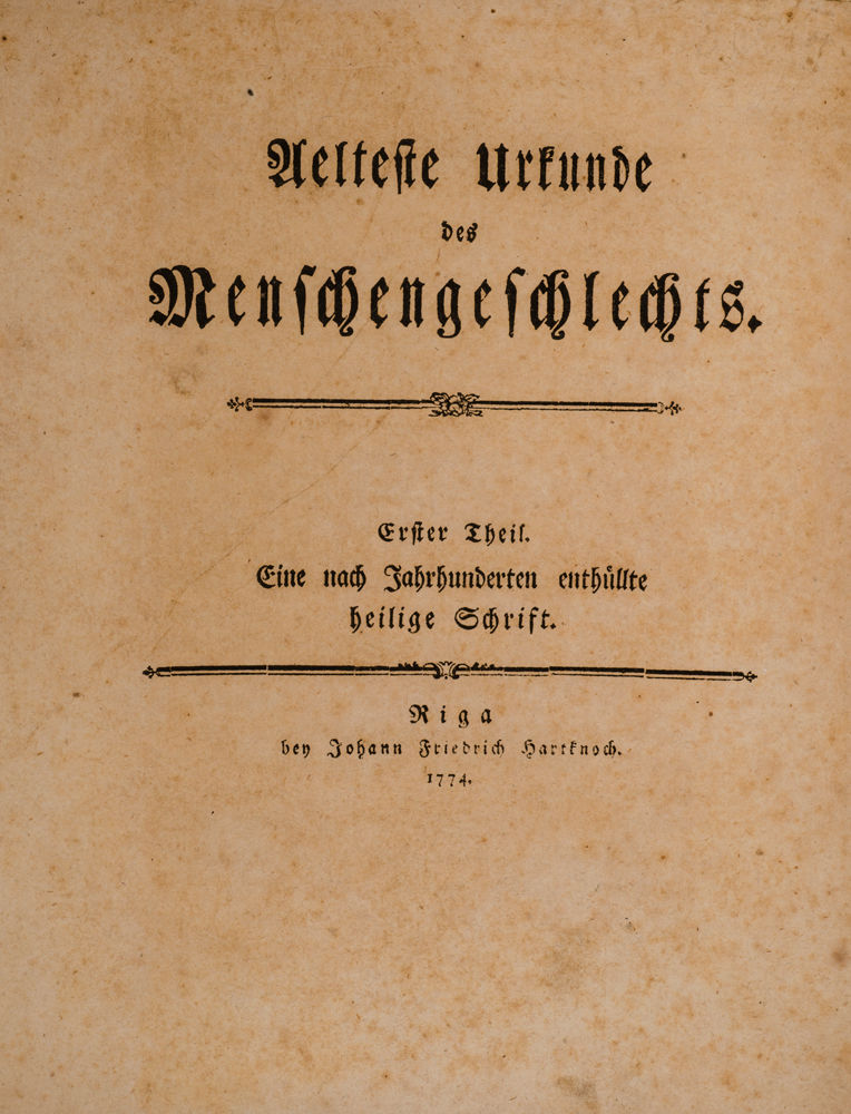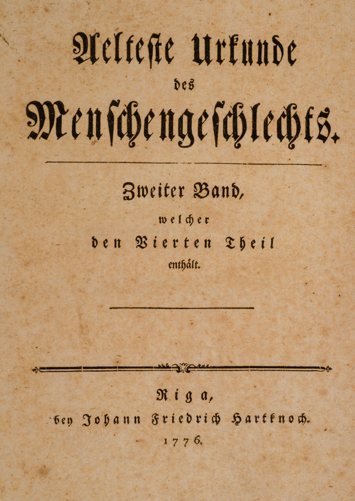 Johann Gottfried von Herder (1744-1803) was a philosopher and literary critic, whose writings were instrumental in forming European romanticism. As the leader of the Sturm und Drang movement, he inspired many writers, notably Goethe, the future leader of the German Romantics (Britannica). Aelteste Urkunde des Menschengeschlechts (which translates to The Oldest Document of the Human Race), is a fascinating work on cosmogany and The Old Testament. Herder says in an earlier version of his Aelteste Urkunde, around 1771 or 1772: "Aber so wissen wir ja nicht das Alter der Welt!" (But we do not know the age of the world). The Book of Genesis, he says, can give us no information on this subject. But in 1774, in the final version of the same work, he says that "die Welt fast sechstausend Jahr alt… ist" (The world is almost six thousand years old). In a sermon of the same year, he says of the three Magi: "… viertausend oder Eins oder Zwei wars, da die Weisen ankamen" (…four thousand years and one or two wars, then came the wise men). Thus it appears that during his most religious phase, he came to accept the Biblical chronology that he had rejected two or three years previously.
