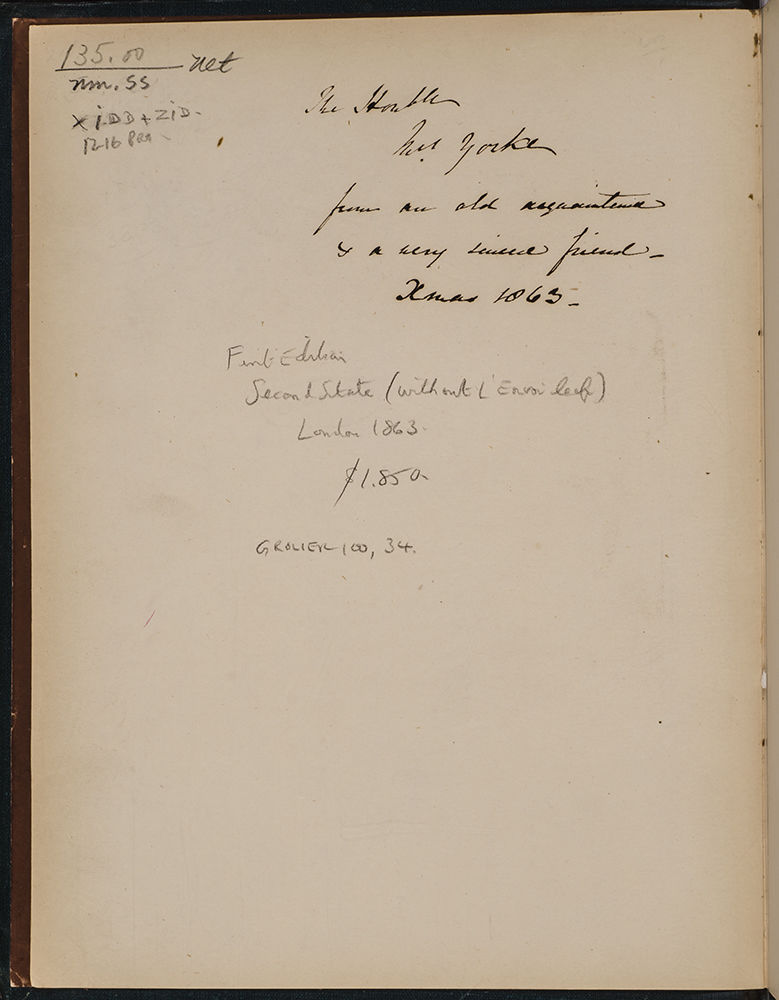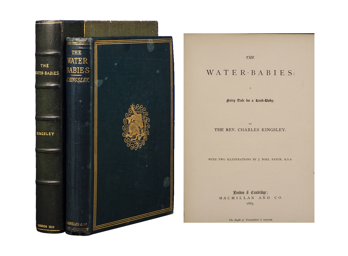 London & Cambridge: Macmillan, 1863. First edition, second state. Near Fine. Small square octavo (8 x 6 1/8 inches; 203 x 155 mm.). [viii], [3], 4-350, [1 advertisements], 1 blank, without the ‘L’Envoi’ leaf which was canceled early on by Kingsley, and inserted frontispiece and full-page illustration opposite p. 145, with eight large engraved initial chapter letters. Bound in original dark green fine-grain cloth, front cover with gilt triple-rule border enclosing a pictorial gilt center device depicting Tom, a Fish and a Sea-Horse. Spine ruled and lettered in gilt. Dark brown coated endpapers, top edge gilt. With the binders ticket of Burn of Kirby St., on the rear pastedown. Unidentified rectangular bookplate on front paste-down. Contemporary neat ink inscription on verso of front end-paper dated "Xmas 1863." A couple of small and very light spots on front cover short splits to the cloth at the lower spine fold, inner hinges with partial expert and almost invisible repairs. Otherwise a Near Fine copy, the gilt bright and fresh, of this scarce children’s classic. Housed in a fleece-lined, quarter green morocco over green cloth clamshell case.