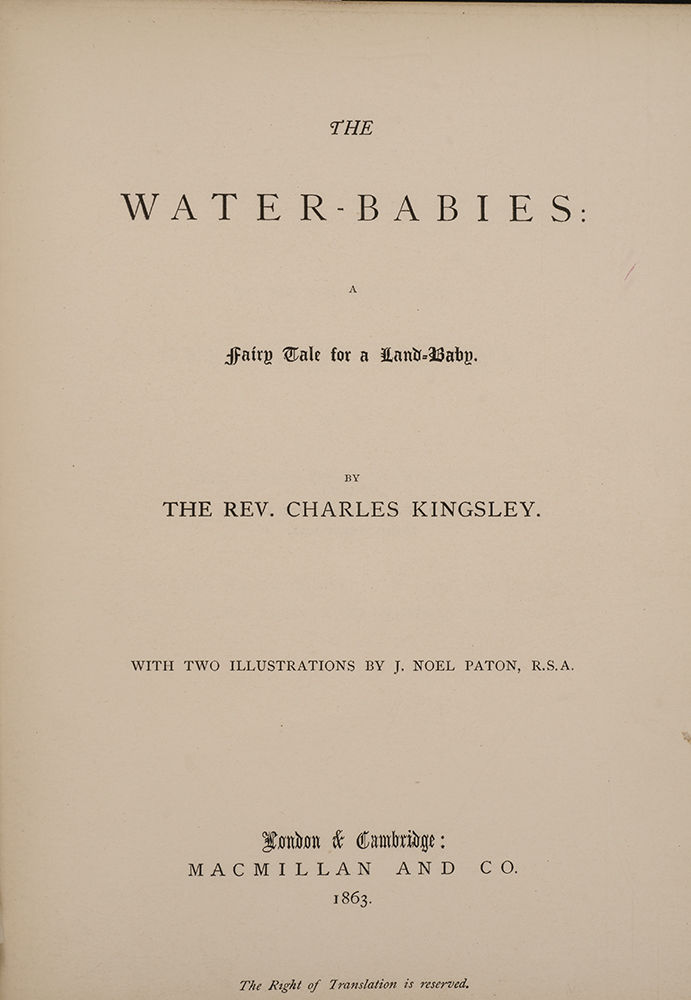 "Charles Kingsley was a rural vicar in Victorian England, and the "land-baby" of the sub-title was his youngest son, five-year-old Grenville Arthur. In writing this fairy tale about the underwater adventures of Tom, a chimney-sweep's climbing-boy, Kingsley uttered many a sermon. But along with his zeal for Anglican Christianity he also brought into play his enthusiasm for nature and his strong sense of indignation at the Victorian practice of using small children as laborers. The difference between the first and second states is solely the removal of the L'Envoi leaf. The first state "contains a leaf bearing a poem, L'Envoi. Kingsley had second thoughts about this while the book was being printed, and he had the leaf removed, but not before a few hundred copies of the book had already gone forth" (Early Children's Books and Their Illustration).
