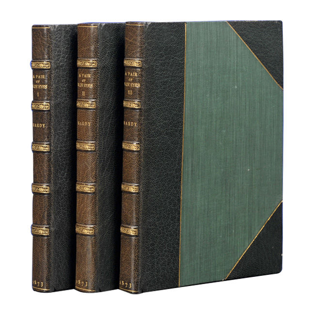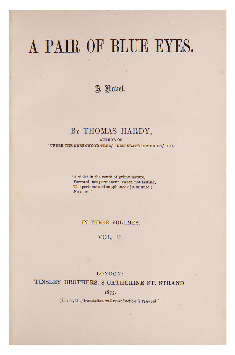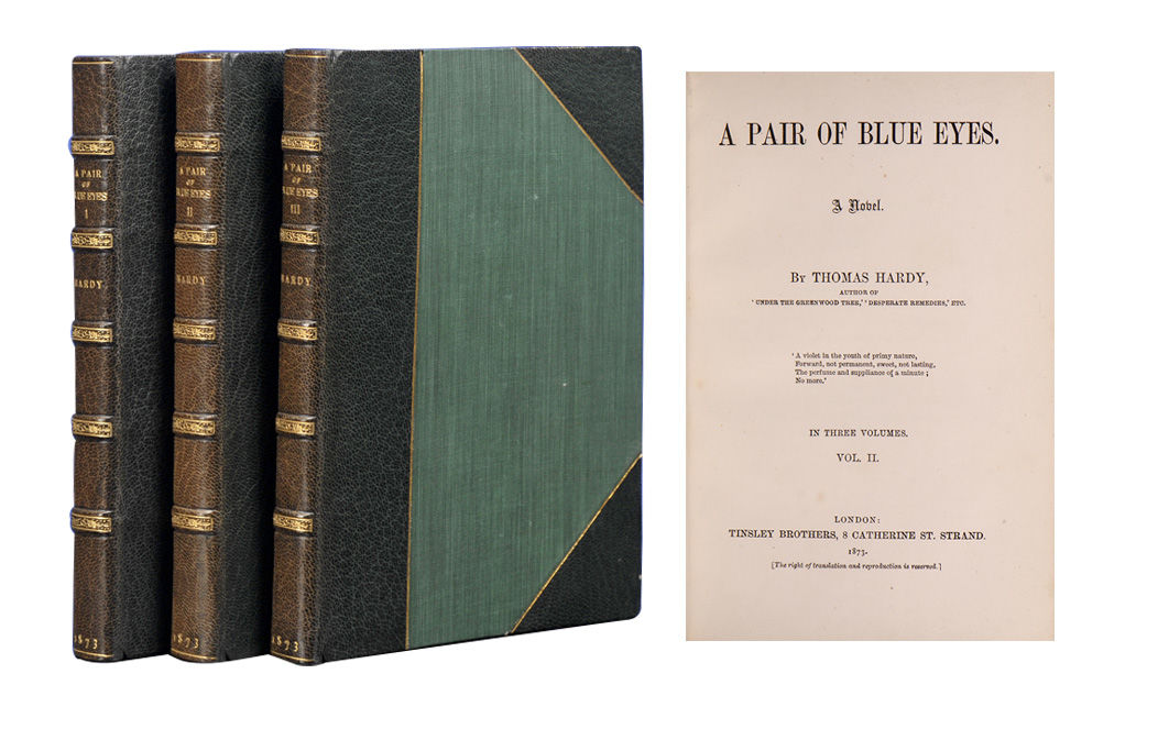 A Pair of Blue Eyes recounts the tragic love triangle between a young woman, Elfride Swancourt, and her two suitors from different socio-economic backgrounds: the ambitious but socially inferior Stephen Smith and the immature but established Henry Knight. “Hardy’s third published novel, A Pair of Blue Eyes has often been overshadowed by the popularity of its successor, Far from the Madding Crowd. Yet it remains notable, not merely for showing the full emergence of those ironies of plot which characterize his later and better-known work but also for its autobiographical qualities. The setting, Stephen Smith’s profession, his reasons for going to Cornwall, and even his embarrassment about his class origins: all these echo the circumstances of Hardy’s courtship of Emma Gifford only shortly before he began writing the novel. The portrait of Elfride herself is perhaps the most interesting of Hardy’s several attempts to capture the charm he found in Emma at their first meeting” (The Cambridge Guide to Literature in English). According to Michael Sadleir in his 'Comparative Scarcities' A pair of Blue Eyes is number I (Sadleir I).