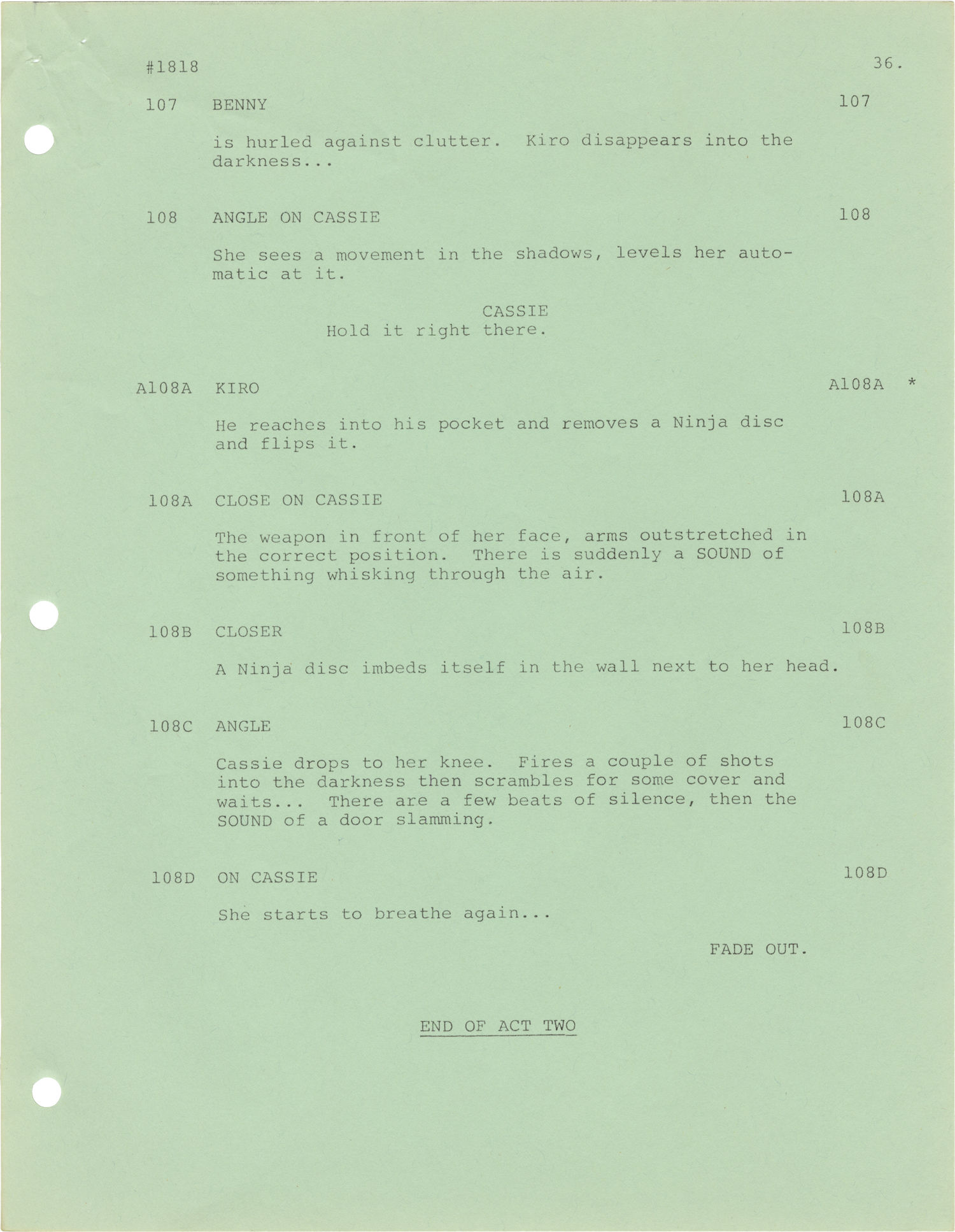 Self wrappers. Title page present, dated January 8, 1982, noted as FINAL DRAFT and production No. 1818, with credit for screenwriter Mark Rosenthal. 71 leaves, with last page of text numbered 68. Xerographic duplication on pink stock, rectos only, with yellow, green, and white revision pages throughout, some undated and some dated 1/22/82. Pages Near Fine, wrapper Near Fine, bound with two gold brads.