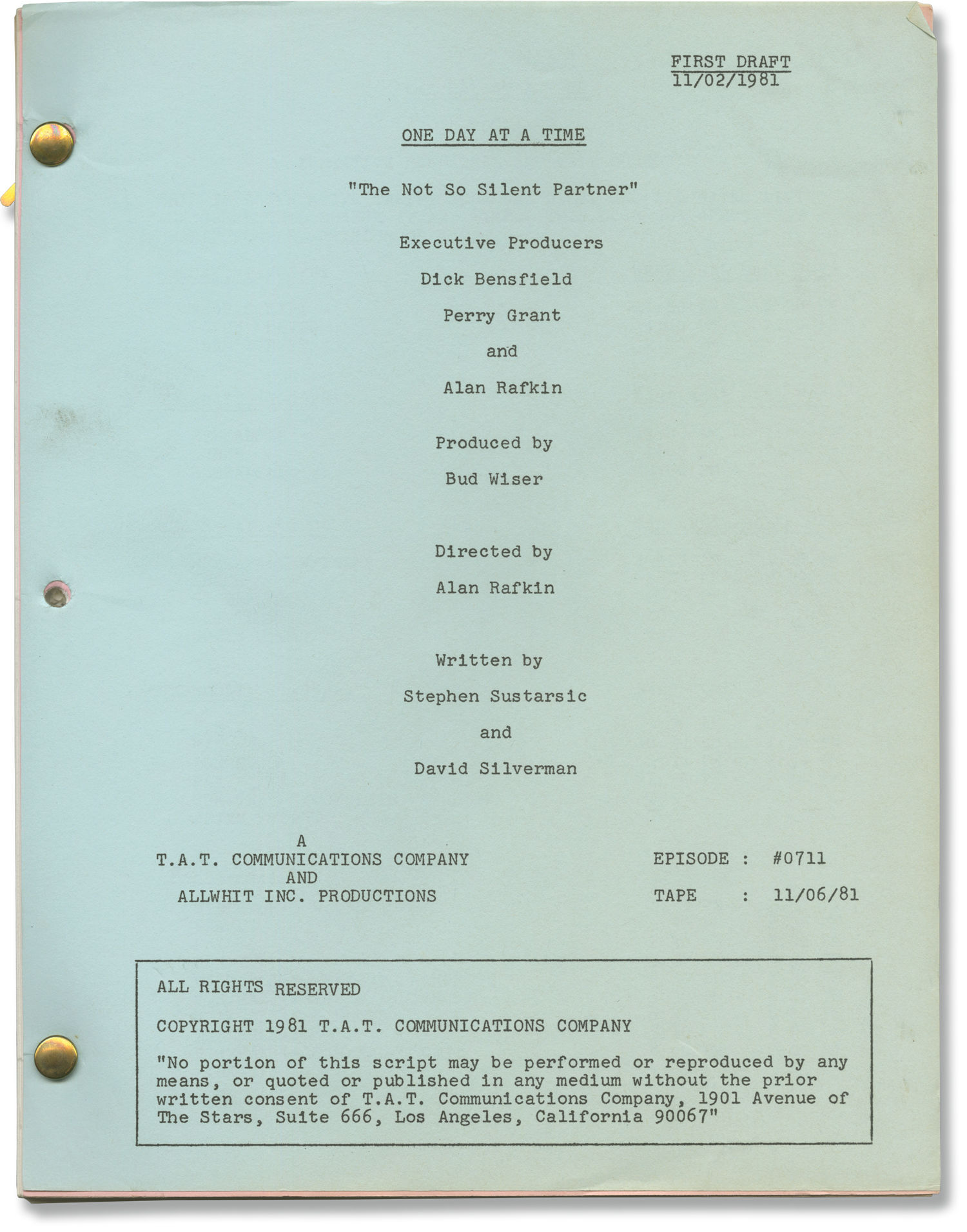 Yellow self wrappers, dated 11/05/1981 on the front wrapper, noted as Final Draft, with credits for Sustarsic, Silverman, Rafkin, and others. 40 leaves, with last page of text numbered 37. Xerographic duplication, rectos only. Pages Near Fine, wrapper about Near Fine, bound with two gold brads.
