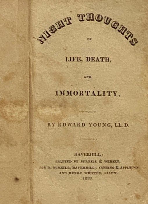 Haverhill: Printed by Burrill & Hersey, for N. Burrill, Haverhill; Cushing & Appleton and Henry Whipple, Salem, 1820. Reissue. Full-Leather. Good/No Jacket. Edges rubbed with minor loss from corners, endpapers foxed, a few small spots on edges, pencil names on endpapers. 1820 Full-Leather. vi, 272 pp. 5 3/4 x 3 1/2. A long poem in blank verse, originally published in nine parts between 1742 and 1745. This edition includes the complete work and a biographical sketch of the author. This work was quite popular in its day, but became more so when William Blake provided illustrations for one of the editions printed in 1797. It influenced the works of Johann Wolfgang von Goethe and Edmund Burke, among others.