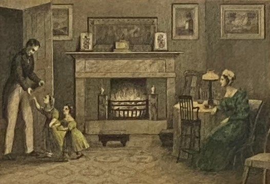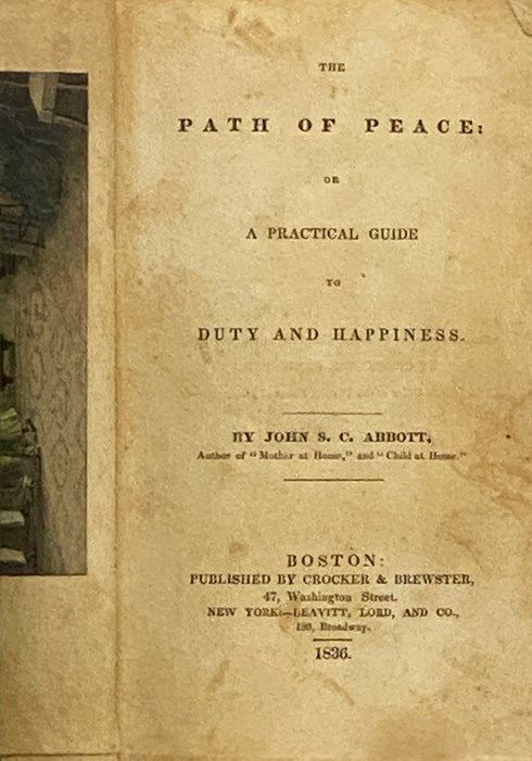 Boston: Crocker & Brewster, 1836. First Edition. Small Hard Cover. Good/No Jacket. 0x0x0. First edition. Boards a bit soiled, pages lightly to moderately foxed throughout, 2 inch chip from corner of rear free endpaper, pencil name (John B. Church) on rear endpaper. 1836 Small Hard Cover. viii, 192 pp. 12mo. 6 3/8 x 4 1/8. Green cloth with elaborate blind-stamped design. Includes hand-colored engraved frontispiece of a man, his two daughters, and his wife before a fireplace. An analysis of moral culture and how it relates to the family, the church, and one's neighbors. Abbott made sure to disabuse us all of a misapprehension of happiness by entitling the first chapter Merriment is Not Happiness.