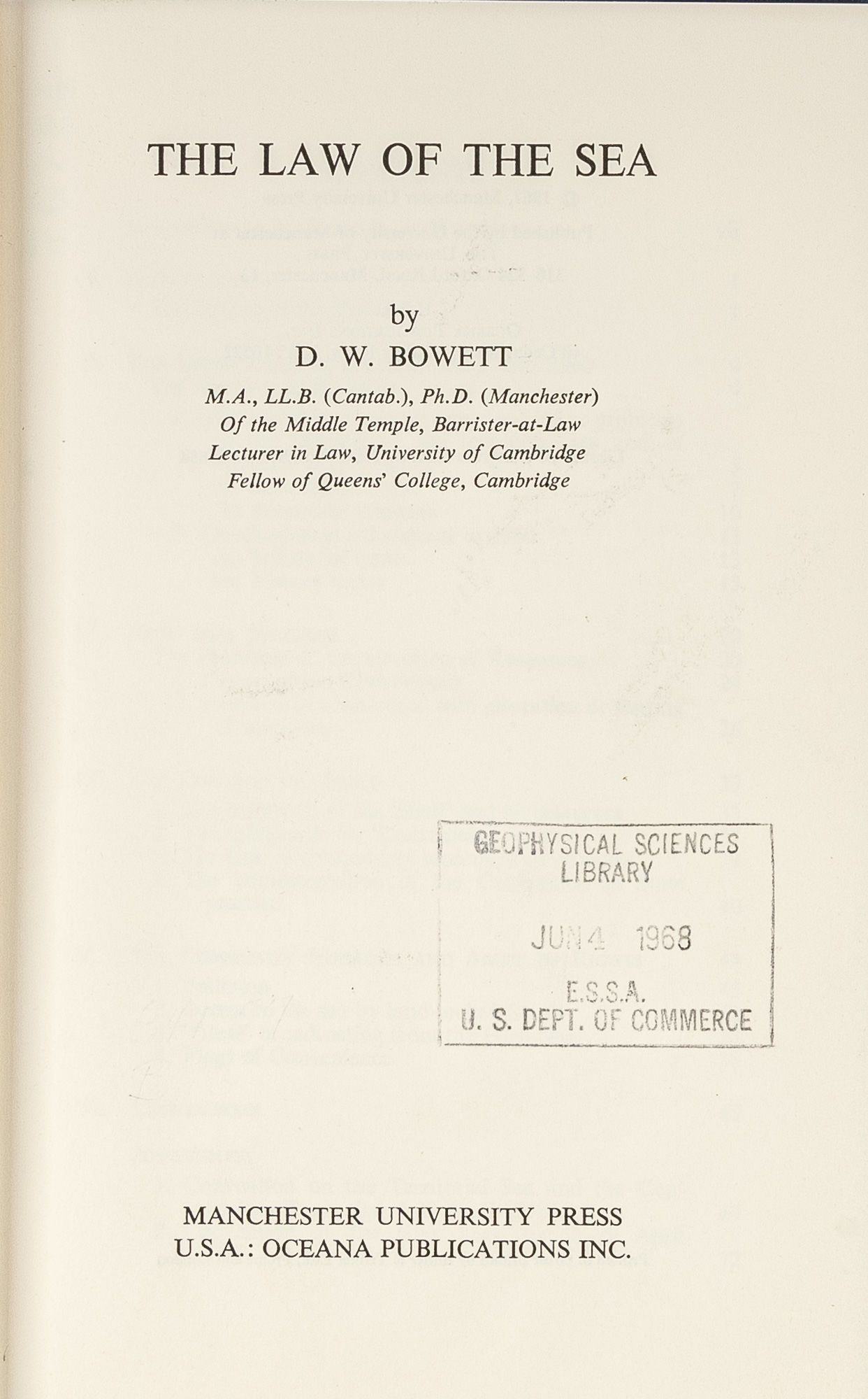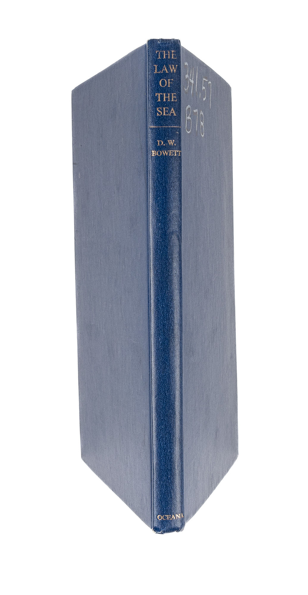1967. Bowett, D.W. The Law of the Sea. Manchester: Manchester U.P.; New York, NY: Oceana Publications, 1967. vii, 117 pp. Publisher's original blue cloth, with gilt stamped spine. Spine ends bumped, boards lightly rubbed. Ex-library, with location label to front cove, library stamps to front free endpaper and title. Card pocket to front pastedown. $50.