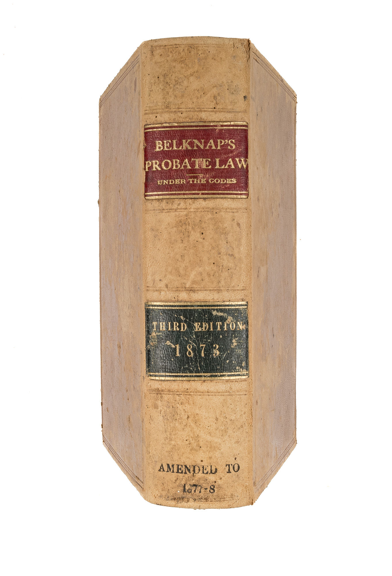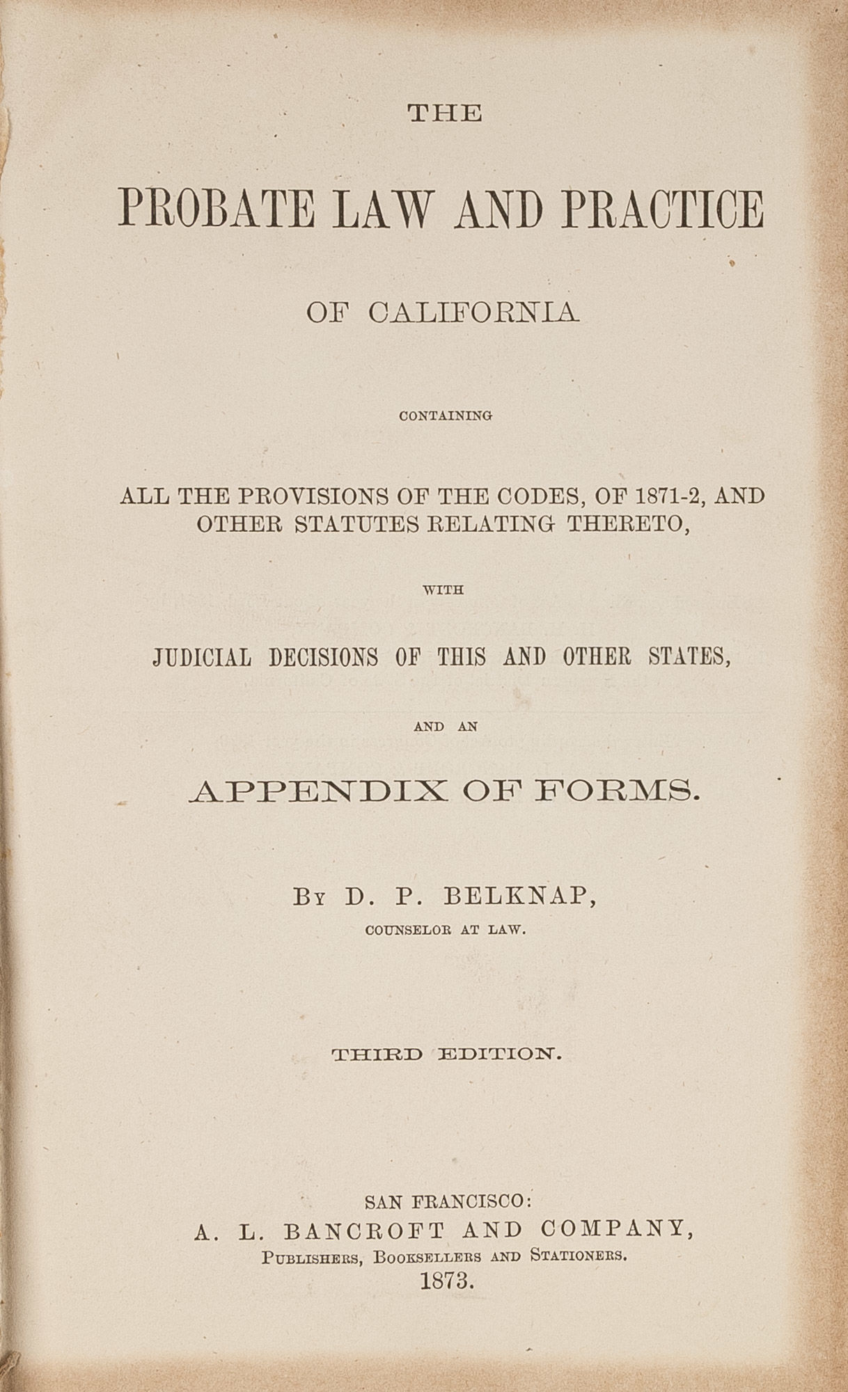 1873. Belknap, D[avid]. P[rice]. The Probate Law and Practice of California: Containing All the Provisions of the Codes of 1871-2 and other Statutes Relating Thereto with Judicial Decisions of This and Other States, and an Appendix of Forms. Third edition. San Francisco: A.L. Bancroft & Company, 1873. xviii, 388, ccliv pp. Sheep cloth, with red and black lettering pieces. Hinges cracked but secure, worn boards. Property stamp to front free endpaper, various penciling throughout appendix. A good copy. $150. * Third edition.