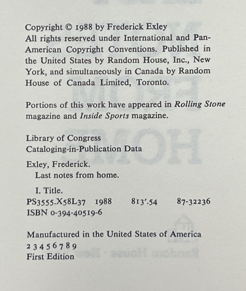 New York: Random House, 1988. First Edition. Hardcover. Fine/Fine. Fine in an about Fine jacket, unclipped ($18.95), lightly bumped at the edges, soiled at the back panel. Quarter blue cloth with blue paper on the boards. Square and firmly bound, clean internally. The final volume in Exley's trilogy that started with A Fan's Notes.