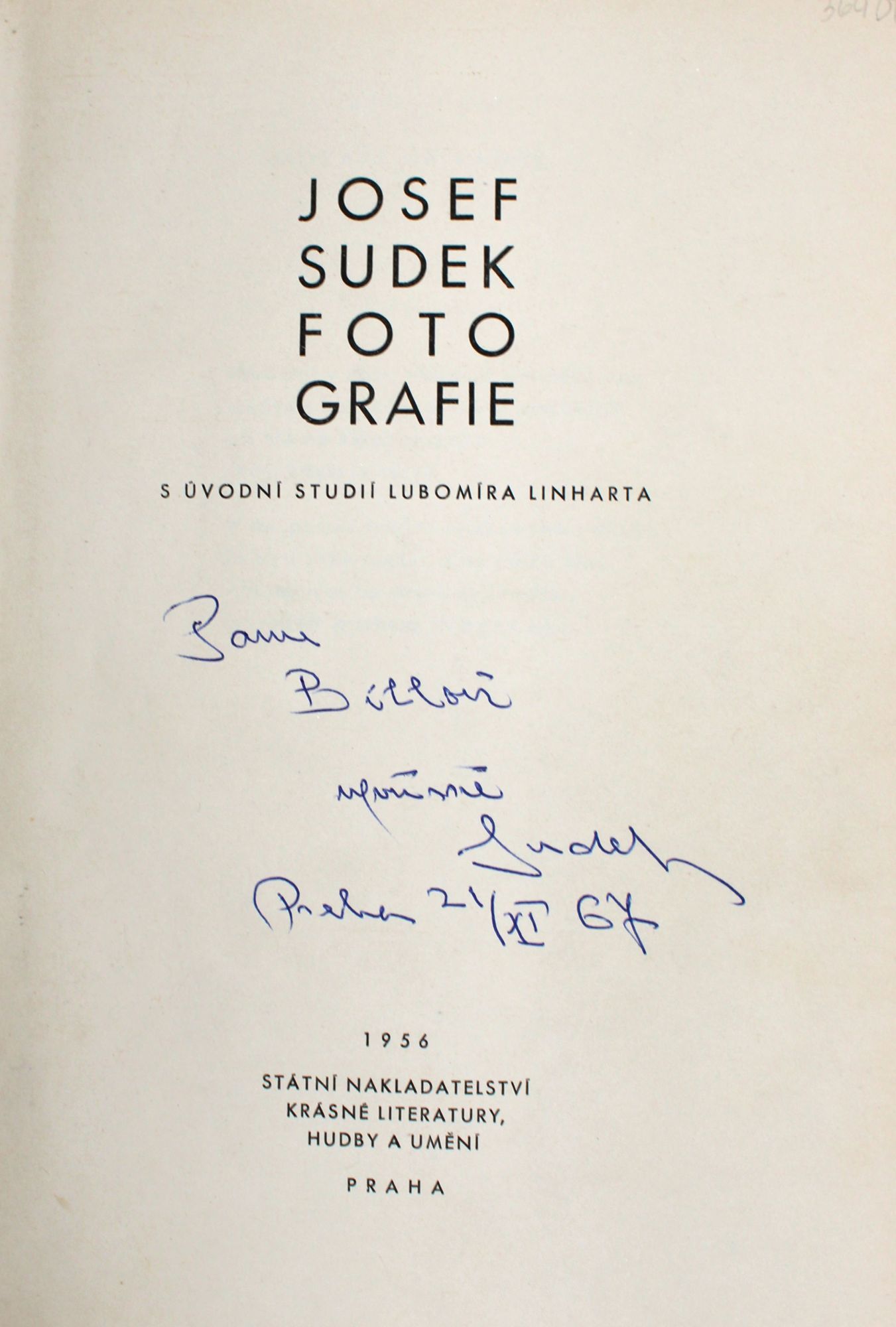 Inscribed on the title page by Sudek in Prague, 21/XI 67. William Alan Piltzer, bookplate to front pastedown