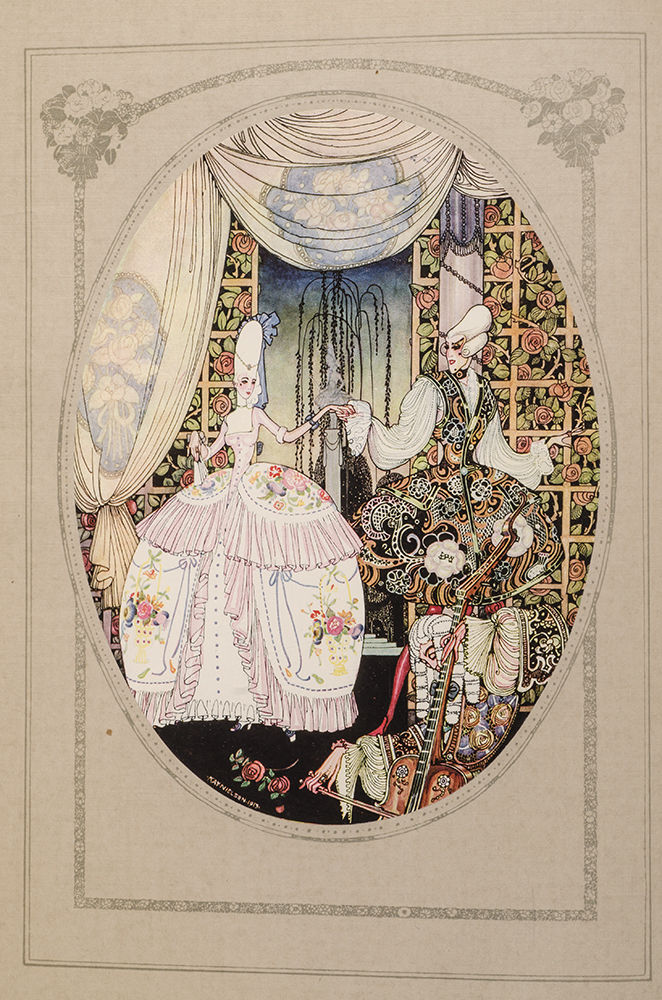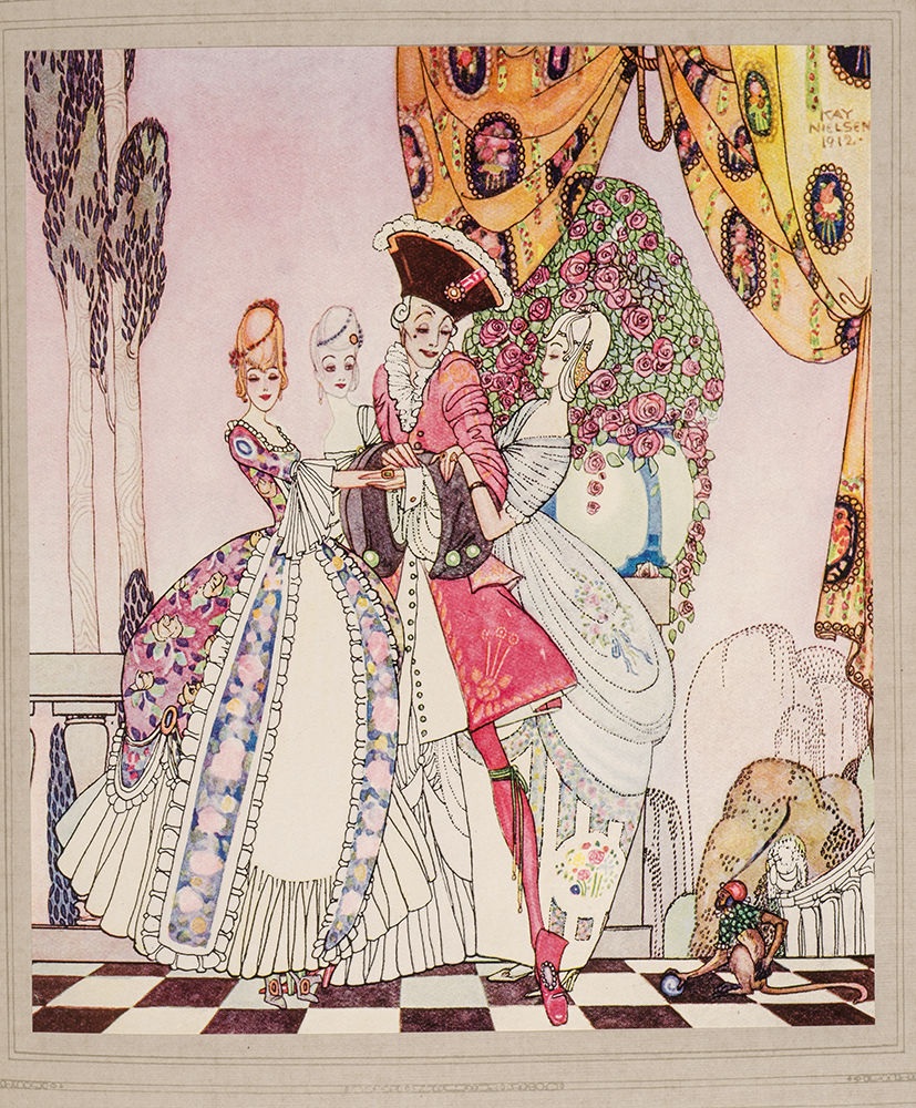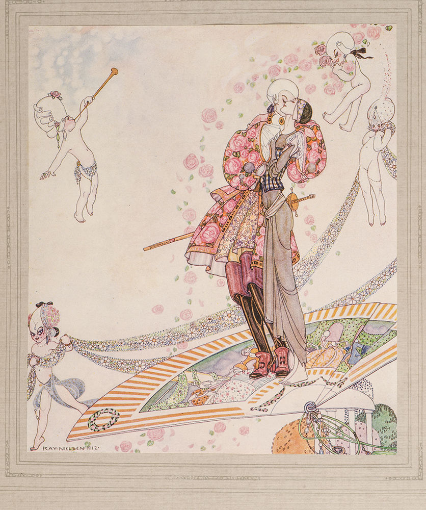 The writer and compiler Arthur Quiller-Couch (1863-1944), is known in part for his anthologies of fairy tales. Here we present his third collection, In Powder and Crinoline: Old Fairy Tales Retold (1913), which includes Minon-Minette, Felicia or The Pot of Pinks, Rosanie or The Inconstant Prince, The Man Who Never Laughed, John and the Ghosts, The Czarina's Violet, and a version of The Twelve Dancing Princesses (The Oxford Companion to Fairy Tales). Danish illustrator and designer Kay Nielsen (1886-1957) created the fantastical illustrations. Nielsen “was drawn early on to fairy tales and illustrated many volumes for Hodder & Stoughton: In Powder and Crinoline (1913), East of the Sun, West of the Moon (1914), Hans Andersen’s Fairy Tales (drawings completed in 1912, but first published in 1924), Hansel and Gretel (1925), and Red Magic (Jonathan Cape, 1930), a collections of fairy tales from around the world. Nielsen’s designs unite strong linearity with delicate colouring…Characterized by a sense of two-dimensional flatness, Nielsen’s objects and people are highly stylized: foxglove blossoms hang in measured asymmetry; princes and princesses stand on improbably long legs; and their garments billow in gravity-defying parabolas. The power of his illustrations lies in his uncanny ability to retrieve a story’s emotional effect on its reader and to recreate it visually in two dimensions” (The Oxford Companion to Fairy Tales).