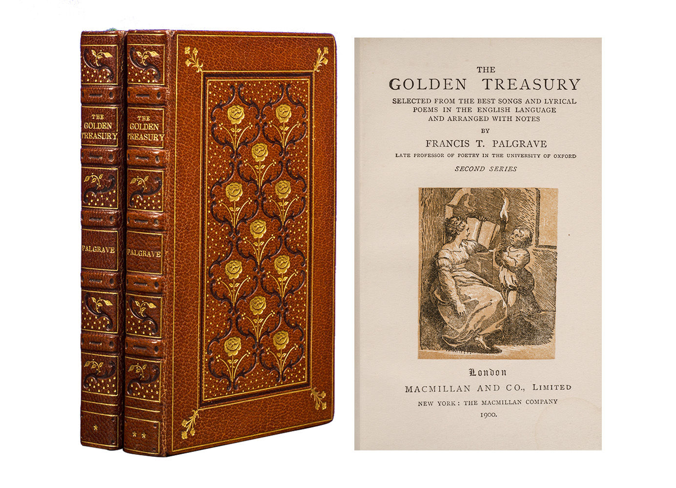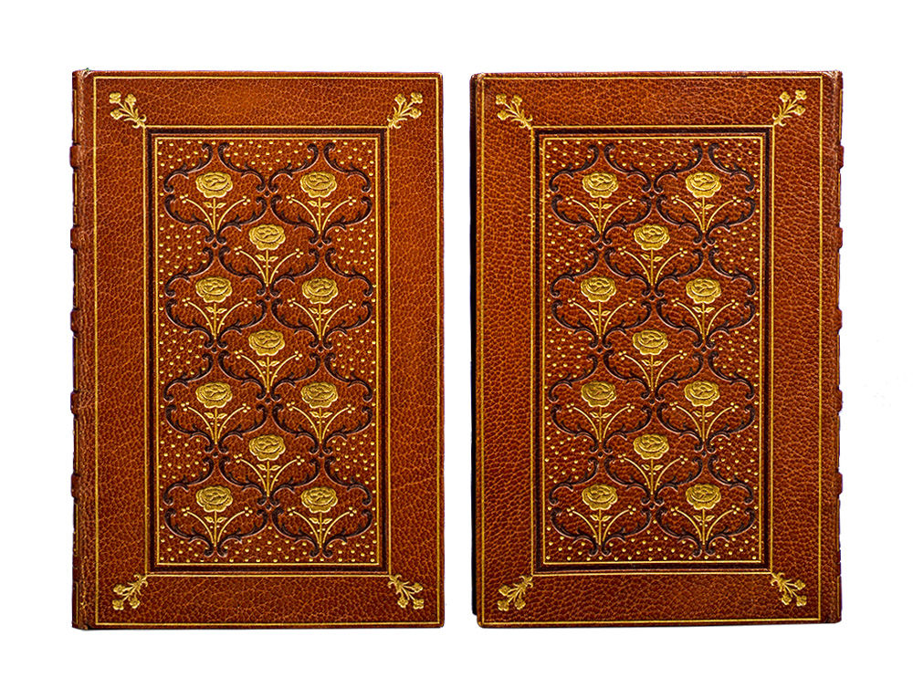 London: Macmillan, 1902. Later printings. Fine. A beautiful set with the rather uncommon Second Series which was first published in 1897. Two small octavo volumes (6 x 3 7/8 inches; 152 x 98 mm.). [xii], 381, [1, imprint]; xii, 275, [1. blank] pp. title-page to first series with engraved vignette, title-page to second series with tinted engraved vignette. Small neat tape repair to front blank leaf in volume one. Finely bound by Zaehnsdorf ca. 1902 (stamp-signed in gilt on front turn-ins). Full brown levant morocco, covers bordered in gilt and blind with gilt floral corner-pieces, enclosing a panel of eleven gilt flowers and stems with gilt pointillé and decorative blind stamping. Spines with five raised bands, decoratively tooled an gilt and blind and lettered in gilt in compartments, double gilt-ruled board edges, gilt ruled and decorated turn-ins, marbled end-papers, all edges gilt.