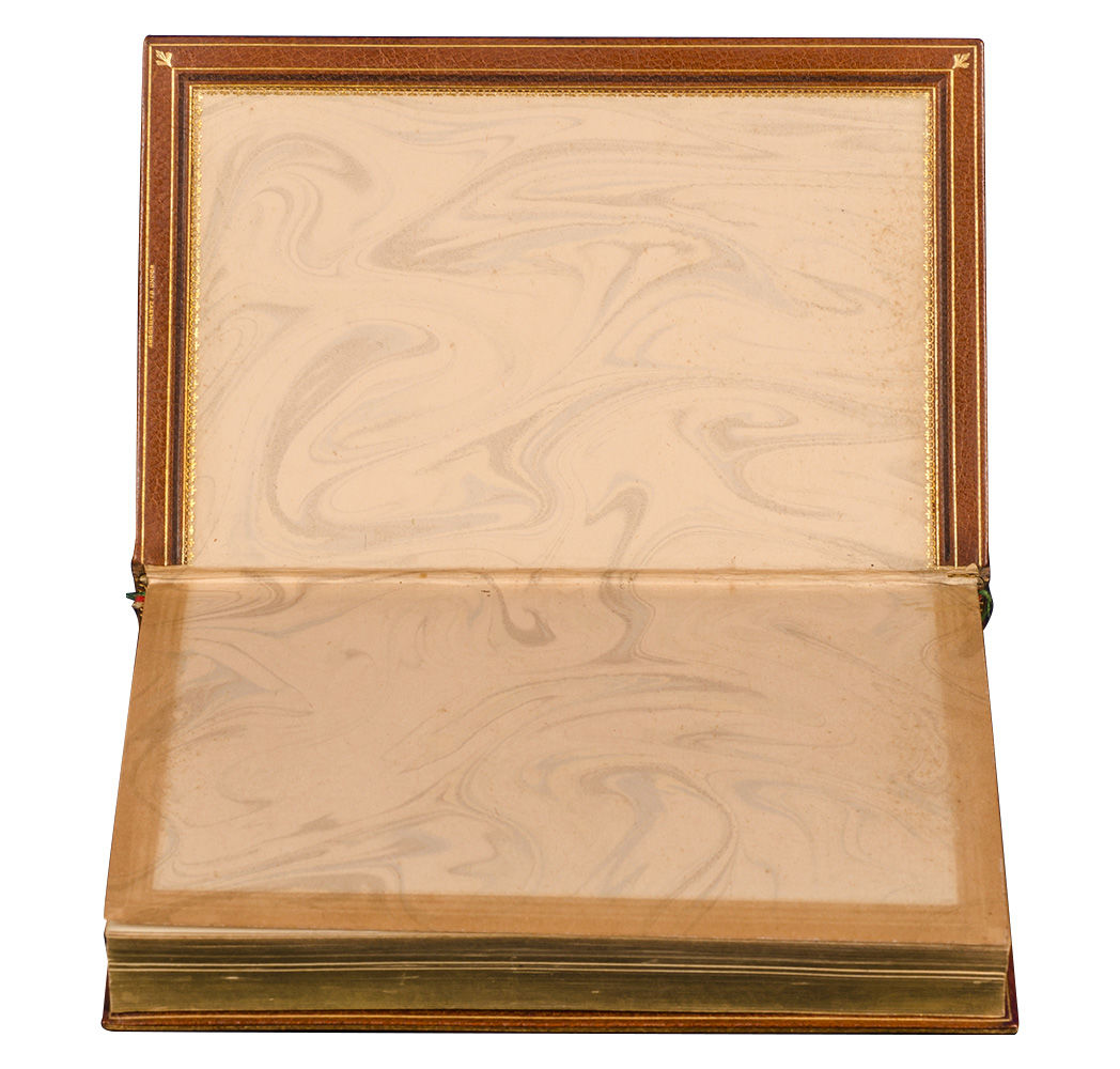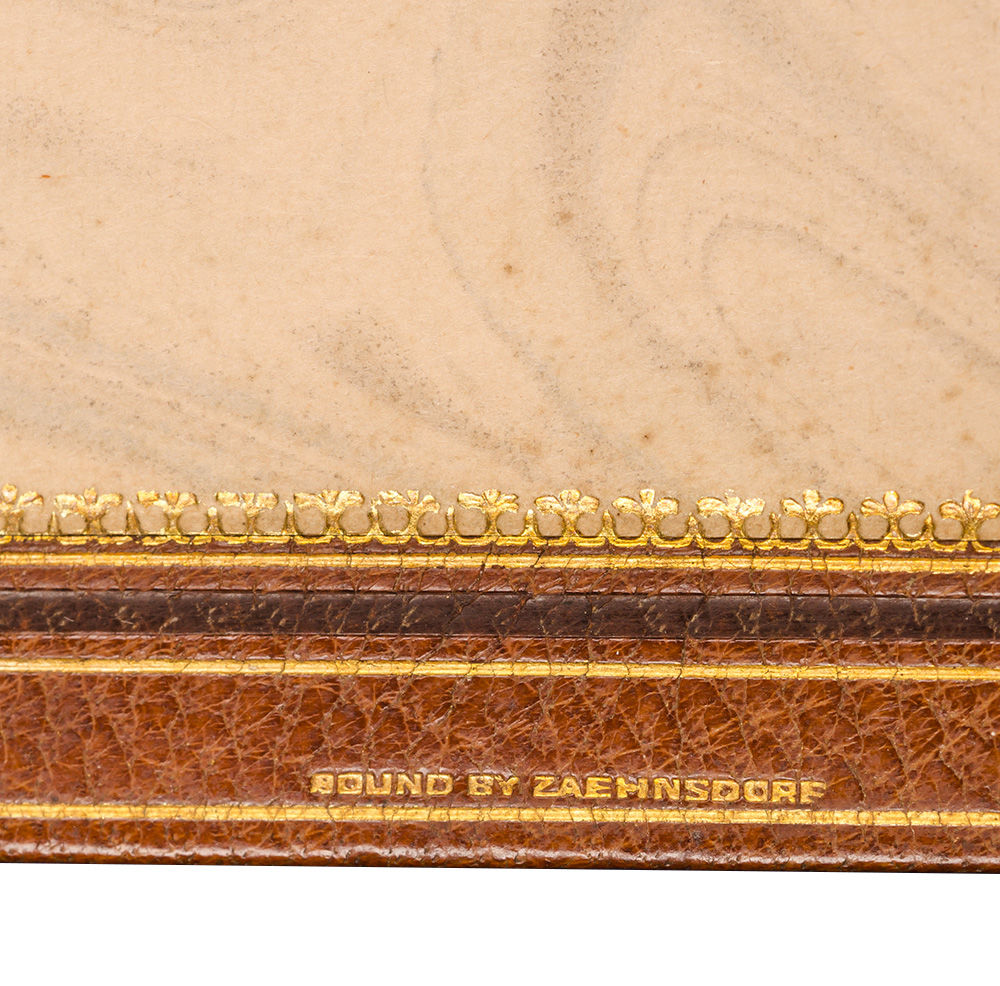 The Austro-Hungarian -born, Joseph Zaehnsdorf (1816-1886) trained with binders in Stuttgart and in Vienna, before moving to Germany, Switzerland, France, and eventually settling London. He working for various shops before opening his own bindery in 1842. In the face of industrializing production Zaehnsdorf embraced craft and eventually gained recognition for his talent. He was known for his precise finish and elegant design. The firm would continue in his son John William’s capable hands; it employed binders like Louis Genth, Roger de Coverly, and Sarah Prideaux. Family run until 1947, it was eventually acquired by Asprey of London in 1983 (Gertz). Fine.