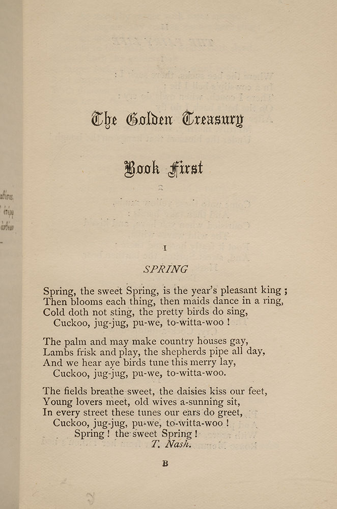 The Golden Treasury of the Best Songs and Lyrical Poems in the English Language was a monumental project, not just aimed at capturing the history of English poetry, but at its core explored what we mean by the poetic form (Kirsh). The book’s immediate impact on British Victorians was significant, and it remains incredibly influential today (Kirsh). “Palgrave poetry is sincere, direct, and beautiful; it approximates song rather than speech; it deals with the most sweeping subjects—in particular, love, death, and nature—rather than the merely personal and local. Palgrave poetry is almost never urban, ironic, obscure, or verbally ambiguous" (Kirsh).