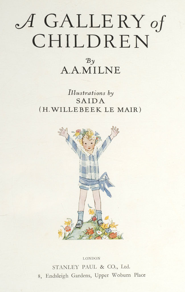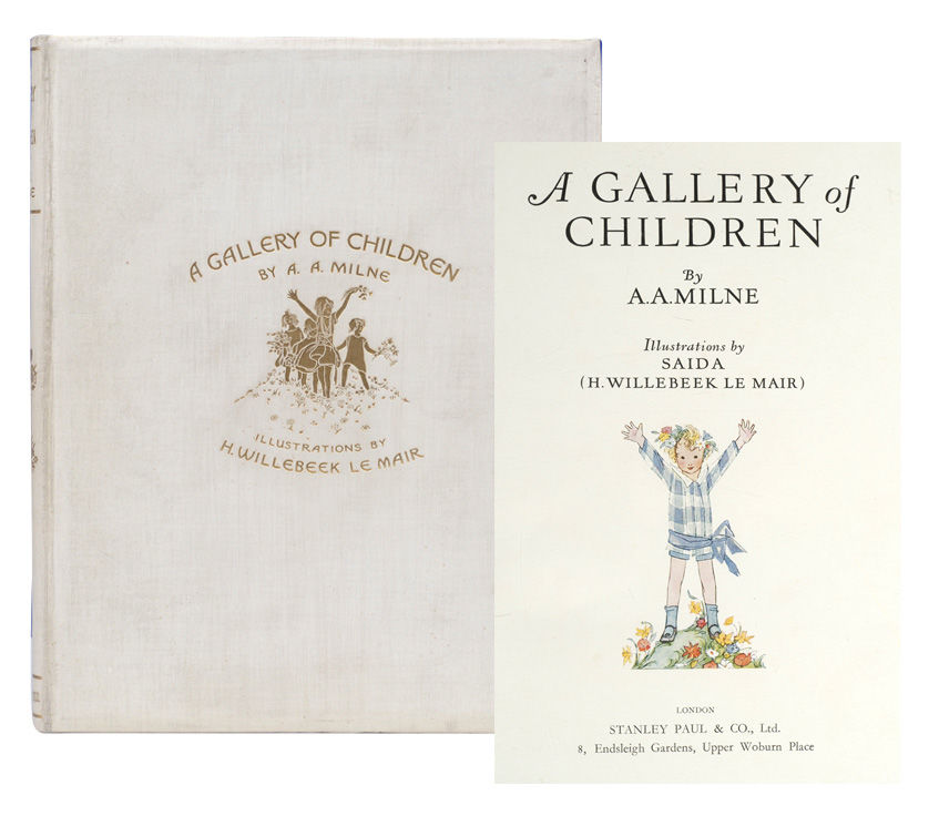 Dutch illustrator, Henriette Willebeek Le Mair (1889-1966) also known as Saida, was famous for her delicate watercolors often featuring decorative cartouches. Her delightful images have appeared on decorative arts as well as in some children’s books, and she appears to have been particularly active between 1911-1917. After her marriage, she and her husband converted to Sufism, dedicating her life to service. Saida’s work style and youthful subject matter resulted in favorable comparisons to Kate Greenaway. Here she brings Milne's fantasy stories to life. Near Fine.