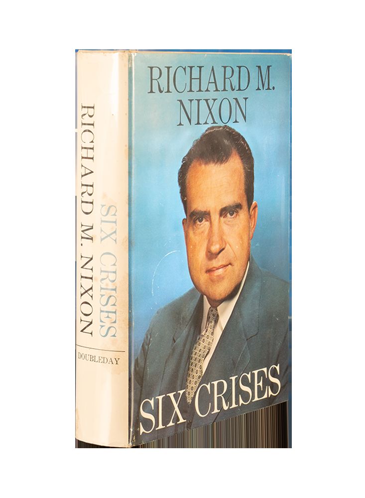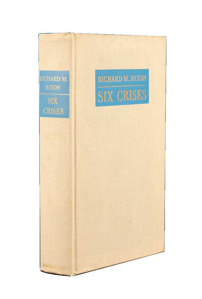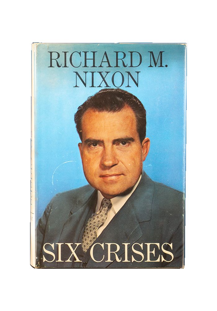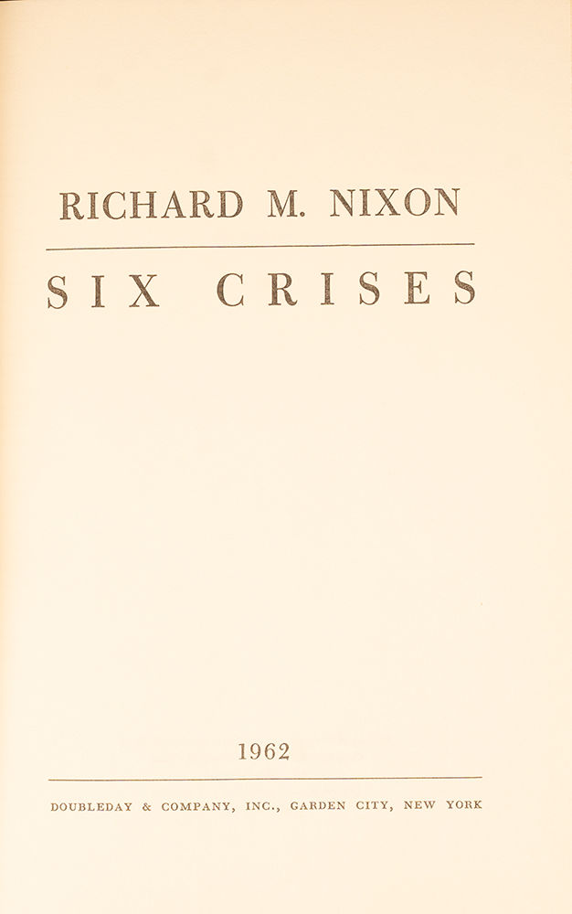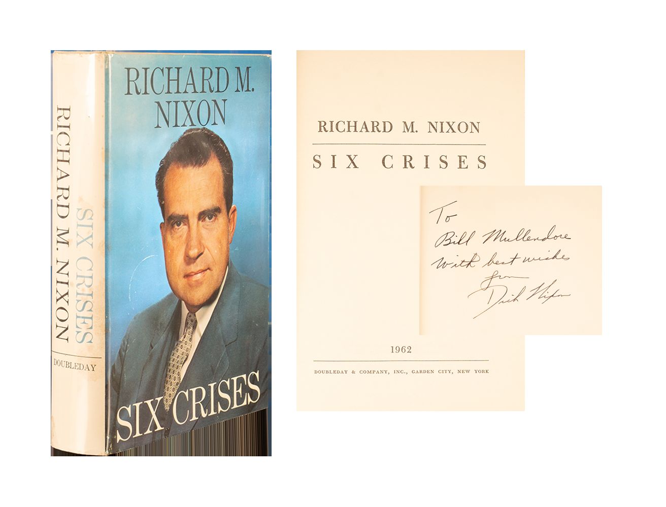 Six Crises is the first book written by Richard Nixon. Modeled after JFK’s Profiles in Courage, this memoir sees Nixon reflecting on his participation in six major political events. The book, composed after his election defeat, gives readers insight into the political mind of a man who would become the 37th president of the United States. A Republican lawyer, Nixon served in both the House and Senate before being elected as Vice President (1953-1961) and late President (1968-1973); an office he held until the Watergate scandal forced his resignation. The book is inscribed to William Clinton Mullendore (1892-1983), the President of the Southern California Edison Company. A conservative, Mullendore opposed the New Deal and New Deal coalition, and was active in the Foundation for Economic Education. Near Fine in Very Good + dust jacket.