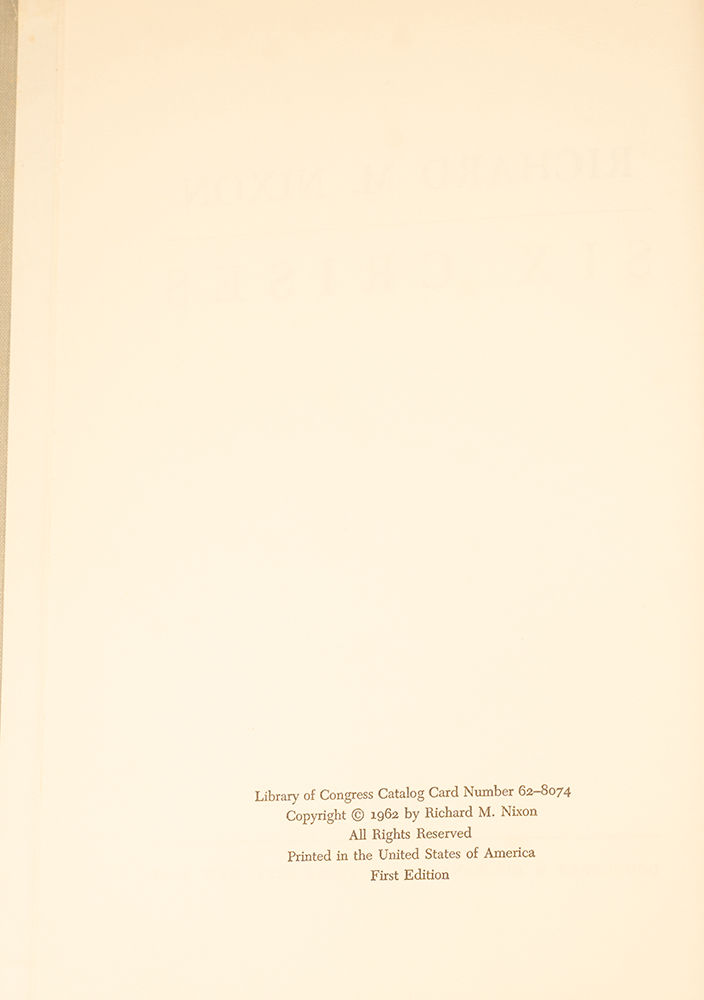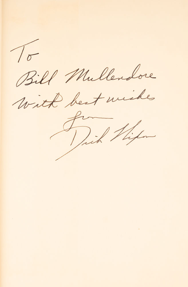 New York: Doubleday, 1962. First edition. Near Fine/Very Good +. A near fine copy in a very good+ dust jacket. Octavo (9 3/16 x 6 1/8 inches; 234 x 155 mm.). [xvi], [1]-460 pp. Inscribed by Richard Nixon to American Conservative Businessman William Clinton Mullendore. Many of the first seventy pages with underlining in blue ink. Bound in publisher's gray cloth over boards, front cover and spine blocked in blue and lettered in gilt. Inscribed on front free endpaper "“To Bill Mullendore with best wishes from Dick Nixon.” In a pictorial dust jacket, with a small closed tear at the base of the spine and creasing on back panel.