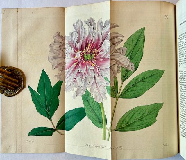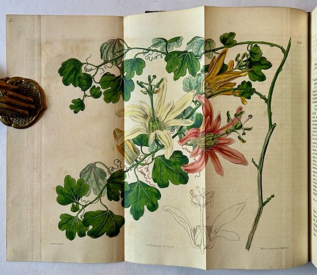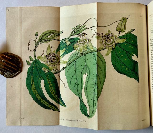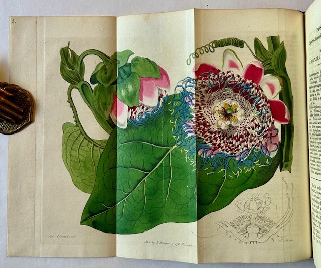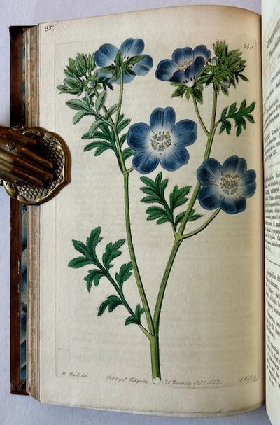 London: James Ridgway, 1824. Full calf. Very Good +. Here offered are 7 early volumes of the 21-volume "Botanical Register", with its hundreds of exquisite hand-colored engraved botanical plates. We have Vols. II and Vols. V through Vol. X, spanning 1816 through 1824. All 7 volumes are in very solid condition, all in either the publisher's original full calf or, at the very least, in a lovely contemporary-to-the-period calf. The roughly 500 hand-colored plates --about 20% of them large fold-outs-- are suffused with bright, rich color, the hues vivid and crisp. Several of the outer hinges show a bit of wear and are slightly tender (though still perfectly sturdy), mild wear at several of the spine ends. Uniform octavos, strong, unrubbed gilt-titling and devices along the spines, attractive gilt-bordering to the panels and wonderful marbling at the edges. Very interesting unnamed armorial bookplates at 6 of the 7 front pastedowns, all 7 volumes boast the bookplate of Sarah Jane Atterbury McGinley at the rear pastedowns. A beautiful set, even if only 1/3 complete, with stunning botanical plates.