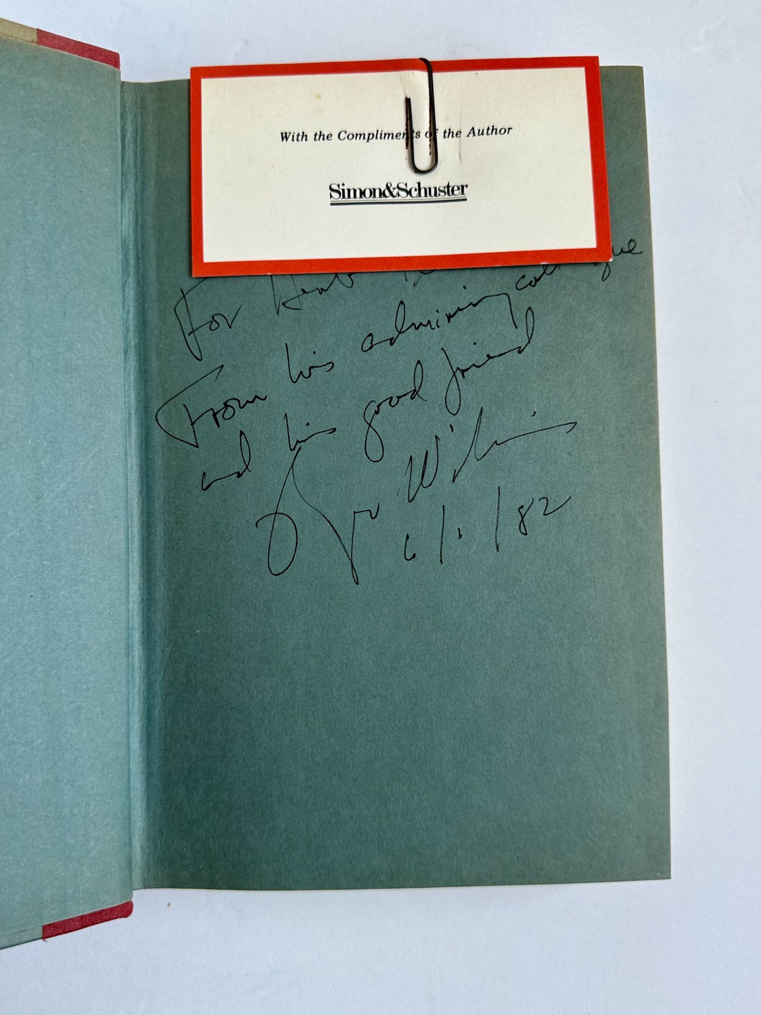 New York: Simon and Schuster, 1982. First Edition, First Printing. Hardcover. Octavo, 384 pages. In Very Good minus condition with a Good plus dust jacket. Spine blue pictorial with red and black lettering. Dust jacket protected in mylar covering, with price uncut: "$17.95." Mild shelf wear. Chipping along edges of dust jacket. Toning and light soiling to covers. Foxing to edges of textblock. Inscribed by Wilkins to Herbert Denton on front free endpaper, dated 6/1/82.
