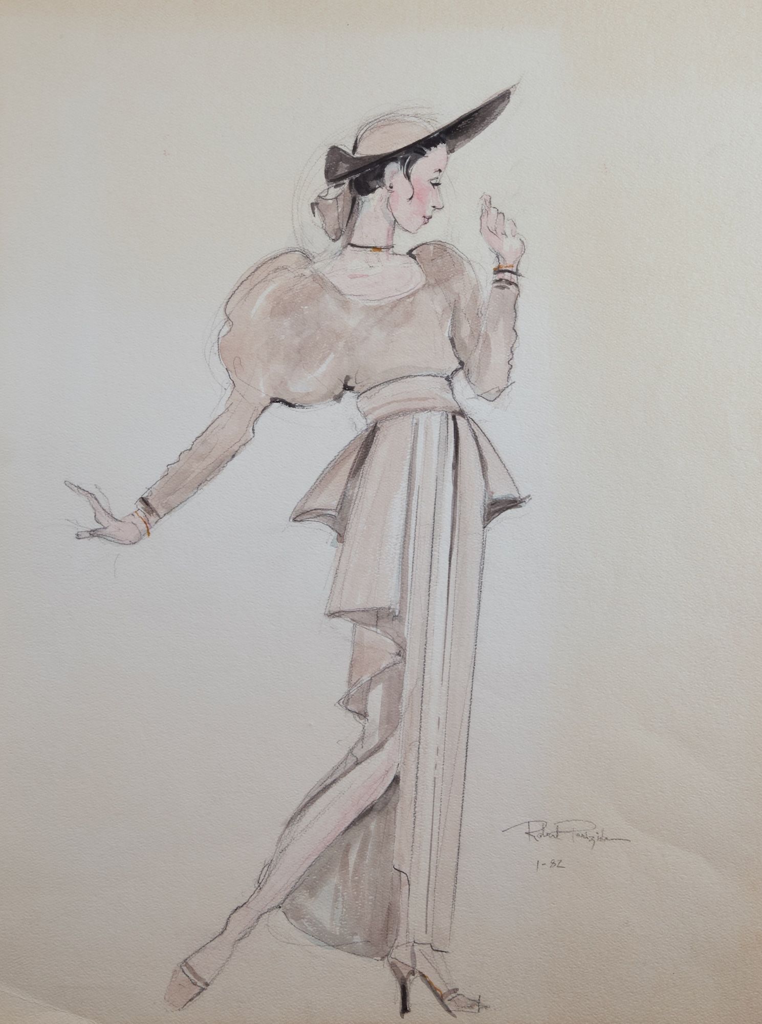 Original large costume design in watercolor and pencil for an unidentified character by noted American artist Robert Perdziola. Signed and dated in pencil January 1982