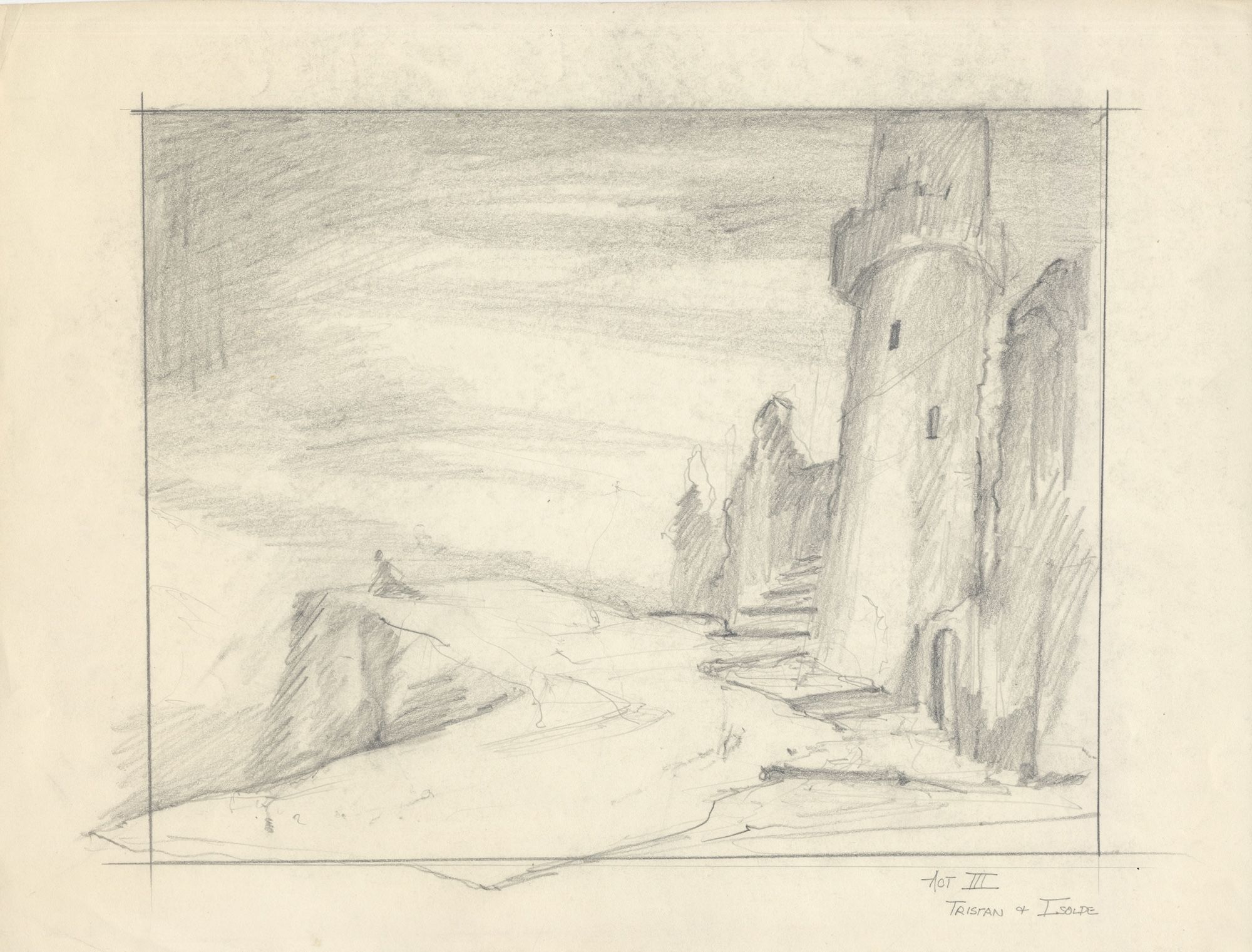 The remaining designs are in pencil and are also identified by the artist as being for Acts I, II, and III, although for different scenes. Sheet size 268 x 355 mm.