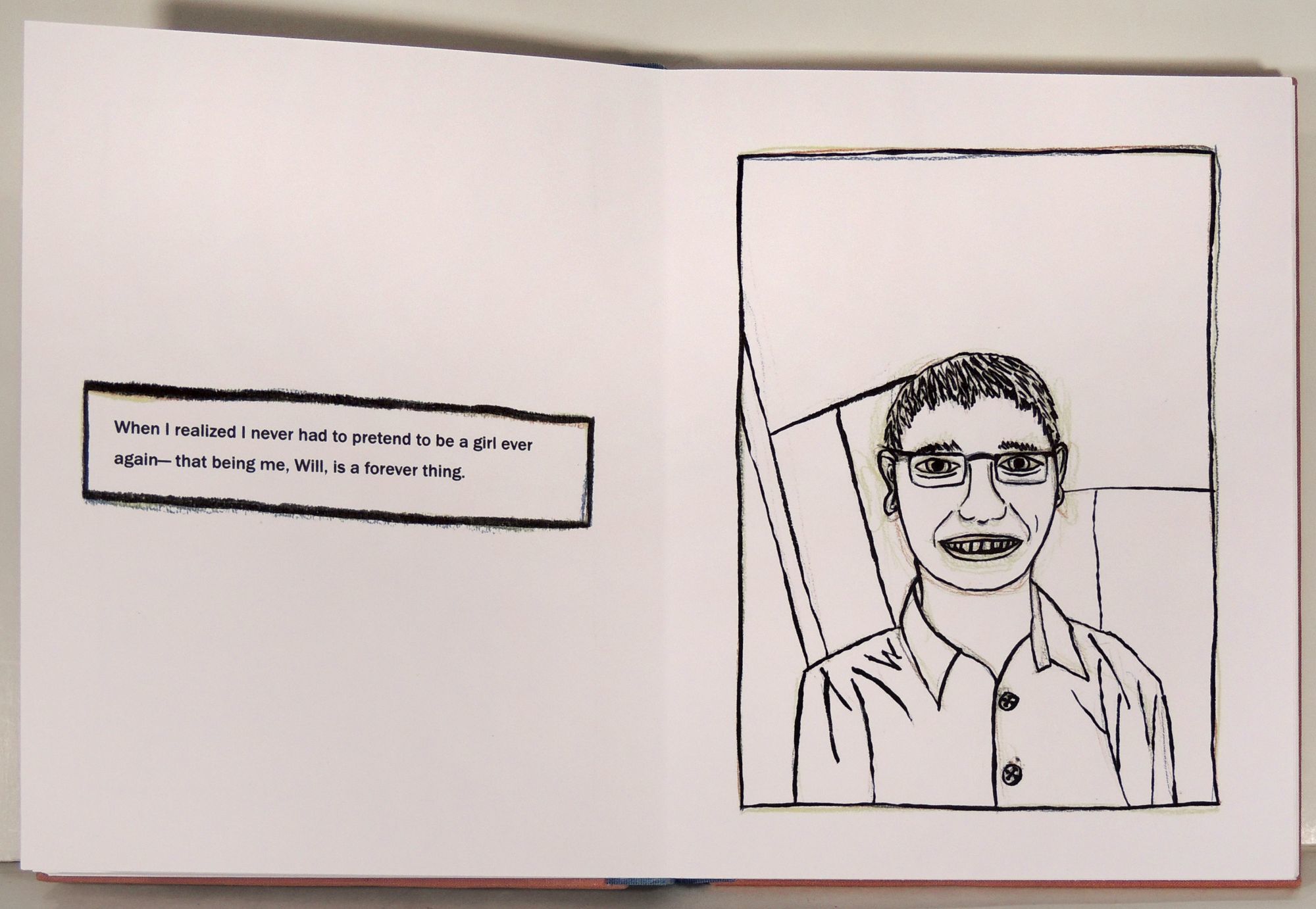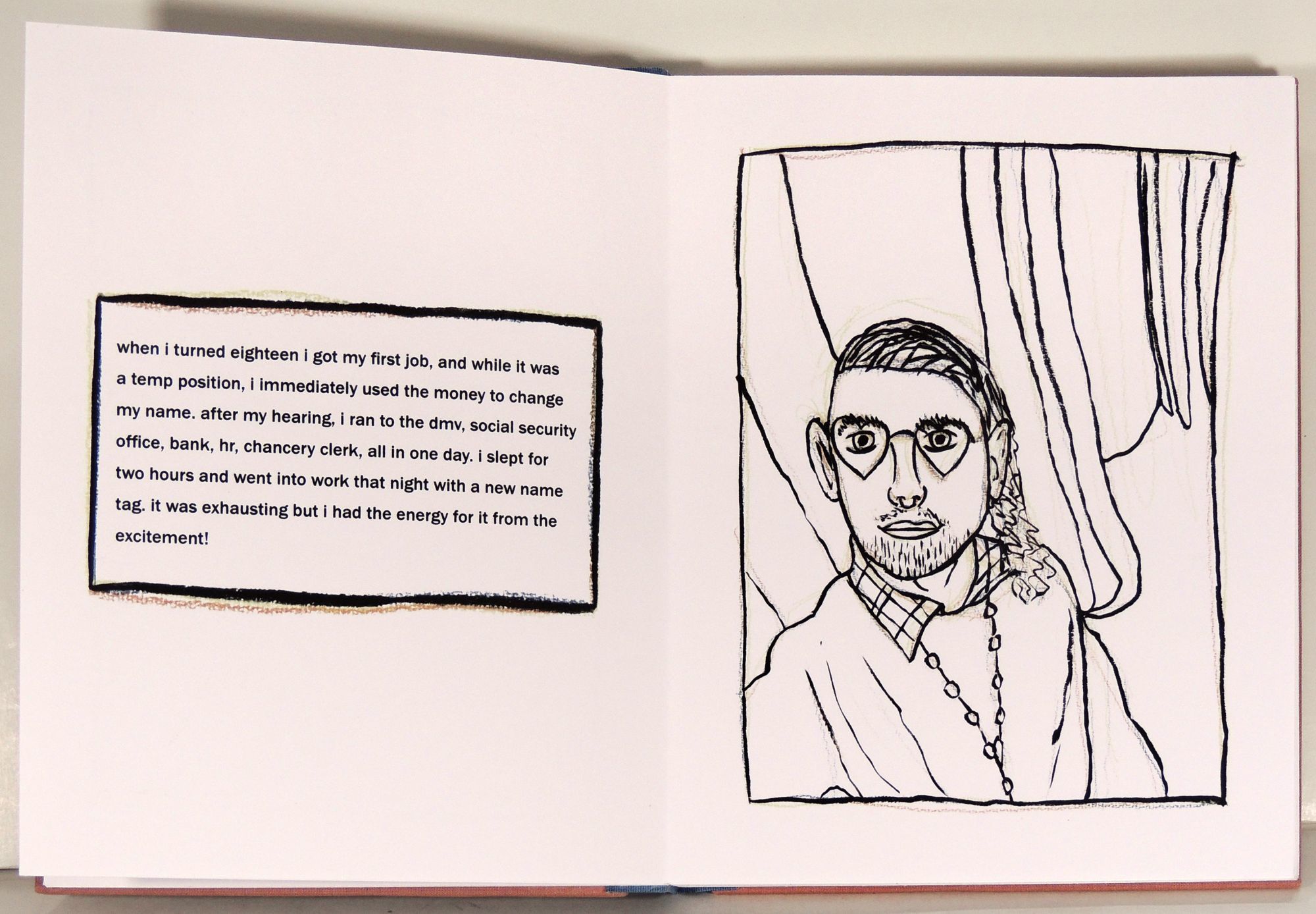 Madison, WI: Blue Rose Press, 2023. Hardcover. Fine. Hardcover. A small open edition. An interview with 18 transgender people, recording their answers to the question: What was a defining moment of your transition? Each interviewee is also documented with a print of an original portrait of them drawn in ink and colored pencil by the book artist. This book was made at UW Madison. Bound in pink cloth boards with blue spine and white silkscreened title and gender symbol to front board. A drumleaf binding printed digitally with elements in color.