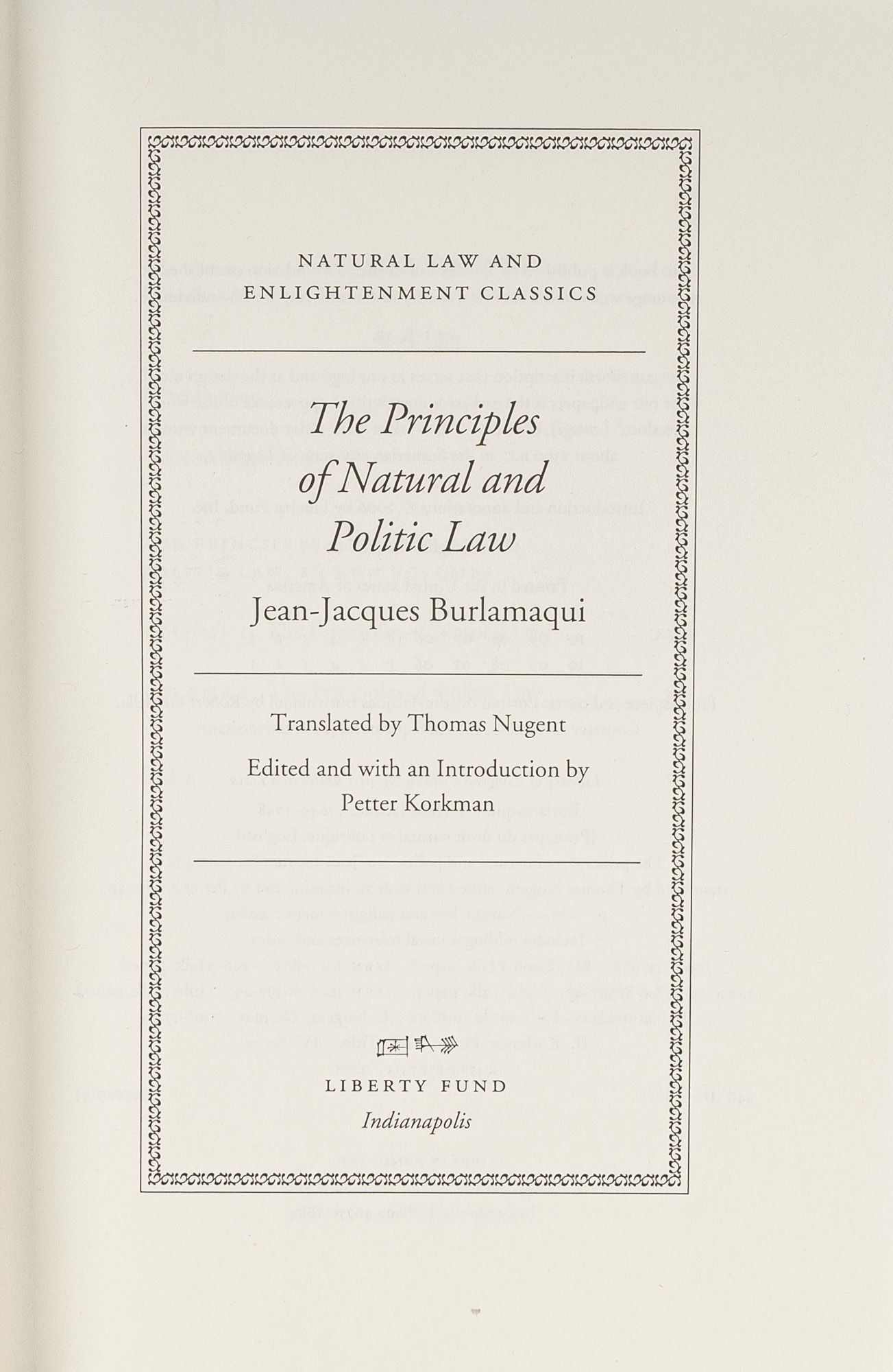 2006. Burlamaqui, J[ean] J[acques] [1694-1748]. Nugent, [Thomas] [1700?-1772], Translator. The Principles of Natural and Politic Law. 2 Volumes in 1. Translated by Thomas Nugent and with an introduction by Petter Korkman. Indianapolis, Ind.: Liberty Fund, 2006. xix, 259; 265-579 pp. Original black quarter cloth to spine, with stamped spine and front cover. Near fine, in a lightly rubbed dust jacket. $45. * Natural Law and Enlightenment Classics.