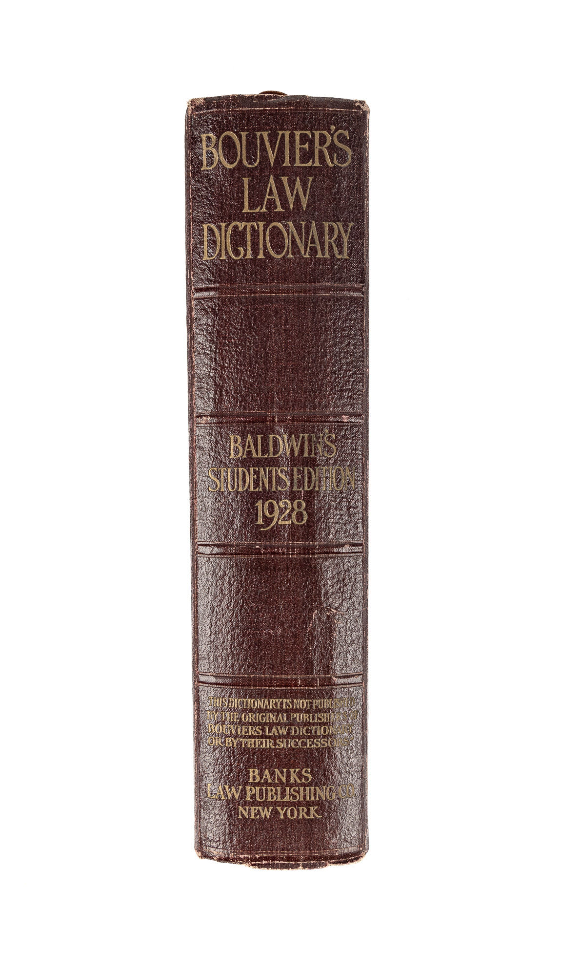 1928. [Bouvier, John (1787-1851)]. Baldwin, William Edward, Editor. Bouvier's Law Dictionary. Student's Edition. Complete dictionary of Legal Terms, Words and Phrases, Glossary of Latin and French Maxims with English Translations. Condensed Encyclopedia of Law. New York: The Banks Law House, 1928. 1245 pp. Textured cloth, ribbon marker, moderate shelfwear. Hinge splitting but secure at page 1245. Previous owner's signature to front pastedown, penciling to rear endpaper, interior otherwise clean. $150. * "The work has been thoroughly revised and contains more than six thousand new titles and definitions. (...) By the use of a three column page, and by the insertion of hundreds of cross references, the production of a one volume edition has been made possible..." (Preface).