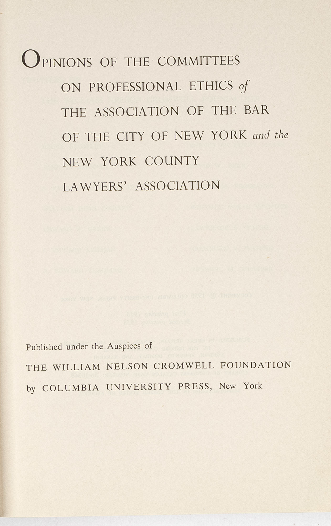 1958. Association of the Bar of the City of New York. Opinions of the Committees on Professional Ethics of the Association of the Bar of the City of New York and the New York County Lawyers' Association. New York: Columbia University Press, [1958]. xii, 905 pp. Publisher's original blue cloth, with gilt stamped spine. Light wear, but very good. Light pen markings to front free endpaper. Else, internally clean. In a worn, price clipped dust jacket. $25. * Contents: Canons of professional ethics [adopted by the Association of the Bar of the City of New York]: p. [837]-853.; Cannons of judicial ethics [adopted by the Association of the Bar of the City of New York]: p. [854]-865.