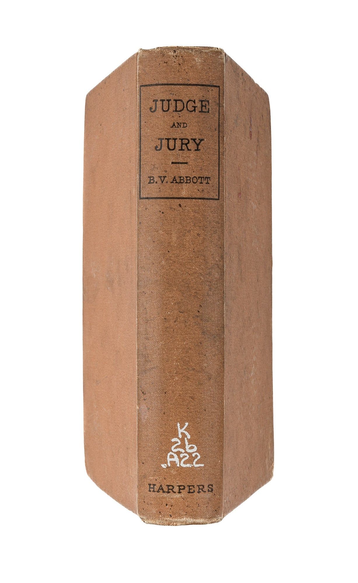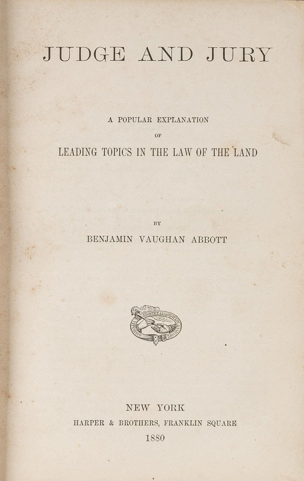 1880. Abbott, Benjamin Vaughan. Judge and Jury: A Polpular Explanation of Leading Topivs in the Law of the Land. New York: Harper & Brothers, 1880. vi, 432, 12pp. Original cloth. Moderate shelfwear with soiling, rubbing and staining especially to front board. Ex-library with ink shelf location label to foot of spine. Bookplate to front pastedown. Internally clean with light foxing. $125. * First edition. Abbott (1830-1890), while known as the draftsman of the New York Penal Code and author of various Reports, has here gathered and enlarged upon some of his popular newspaper articles on legal topics of general pubic interest such as "Colonial Jurisprudence," "The Indians," "Admiralty Jurisdiction," "Marriage", Sunday laws, transportation, "rules which bear upon every-day life and have entertaining aspects" and such. An intriguing window into the mind of the esteemed Codifier. Marke 246.