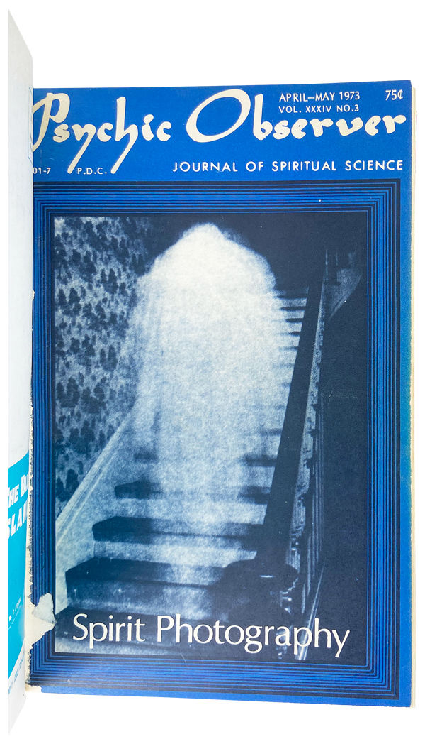 Washington, DC: Psychic Observer, ESPress, Inc, 1973. Very Good. Washington, DC: Psychic Observer, ESPress, Inc., 1973. First Editions. Octavo (22cm). Six consecutive issues in original wrappers, bound together in tan cloth with white stamping to spine. Black and white illustrations. Ex-library with internal institutional stamps and barcode mounted to rear free endpaper. Issues slightly and uniformly trimmed with occasional slight loss to text along top edge, but none to interior. Light shelfwear and a few stray pen marks and smudges to boards. Binding sound and, aside from aforementioned institutional markings and stamps, interior unmarked and text legible throughout. A Very Good collection of this Spiritualist magazine, originally founded in 1937.