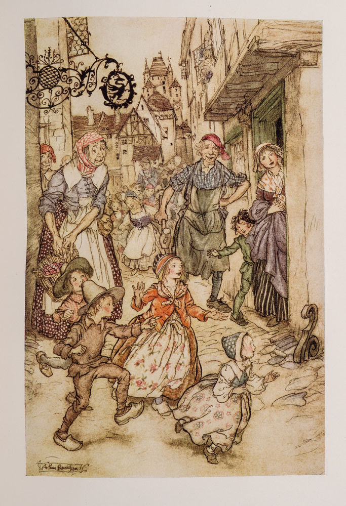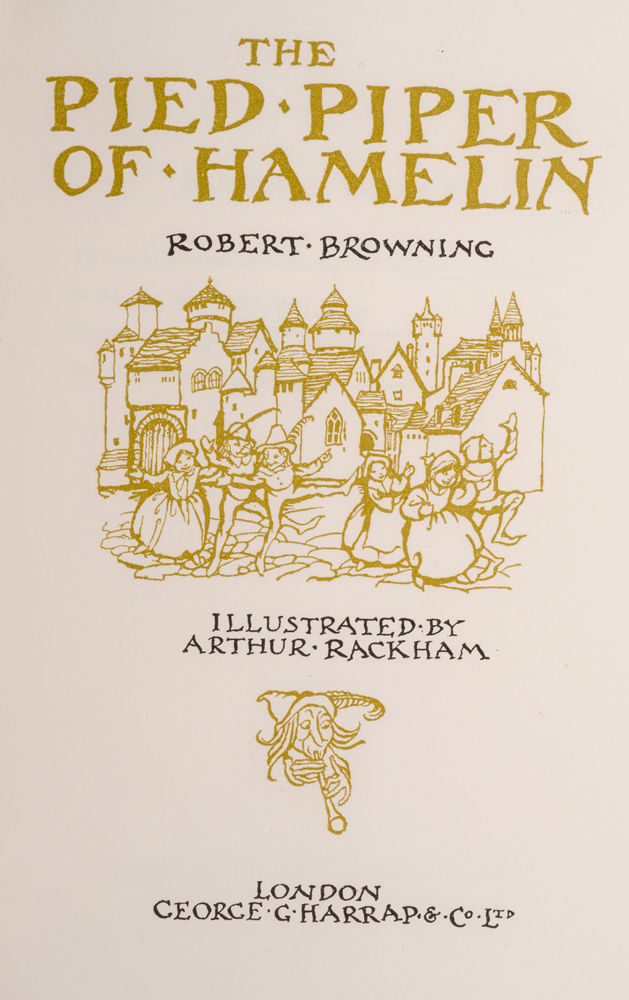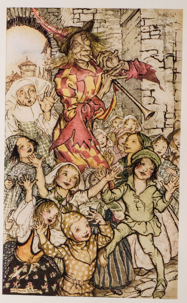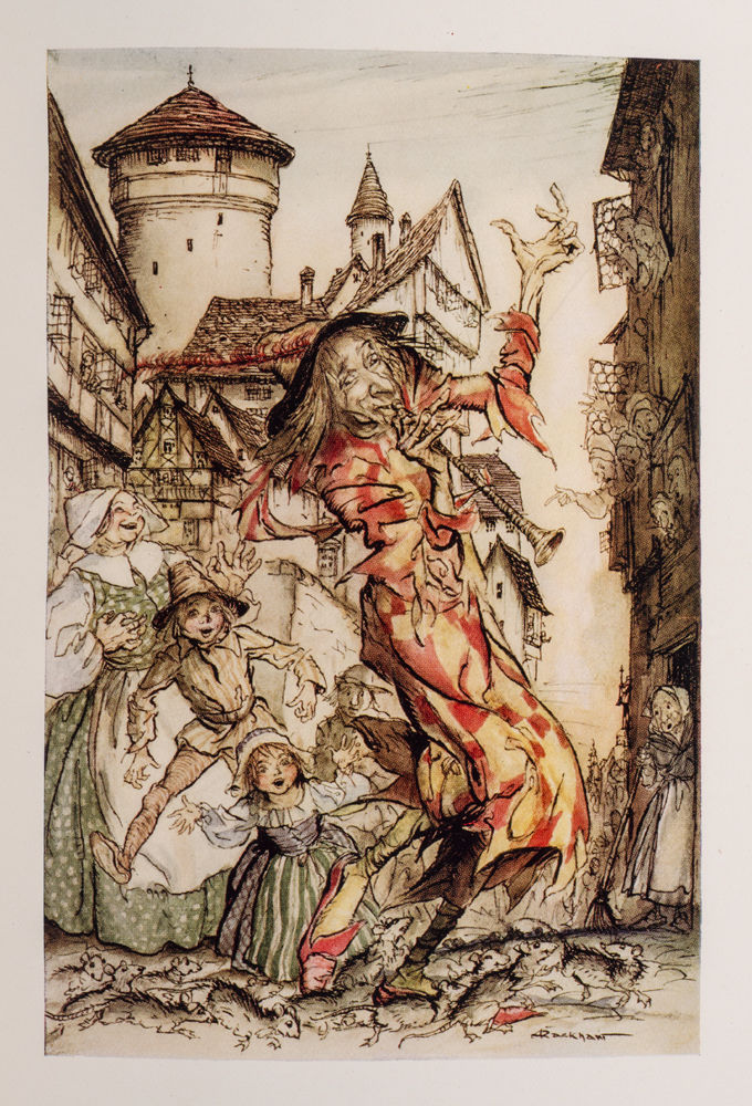 Victorian poet Robert Browning's interpretation of this German legend meets its visual counterpart in Arthur Rackham's illustrations. In this medieval cautionary tale, the Pied Pieper uses song to lead rats away from towns, but when local townspeople refuse to pay him, the Pied Pieper takes revenge and uses his magical pipe to lead the town's children to their demise (although the children's fate varies depending on the telling).