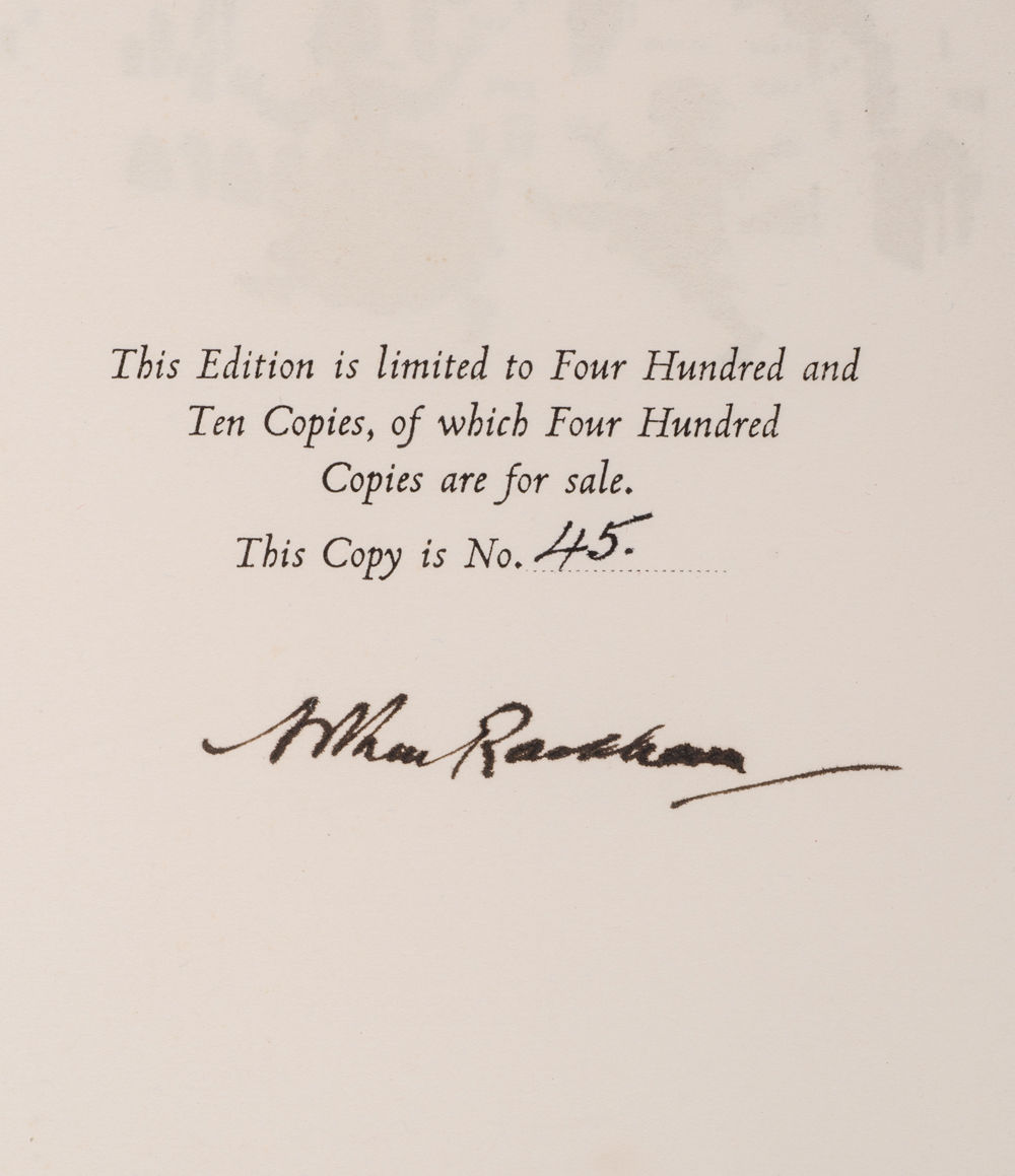 London: George G. Harrap & Co, 1934. First thus. Fine/Near Fine. Edition deluxe, number 45 of 410 copies, signed by Arthur Rackham. A Fine copy in nearly Fine dust jacket. Octavo (9 1/8 x 6 inches; 232 x 152 mm.). 44, [1], [3, blank] pp. Four color plates and fourteen drawings in black and white (including one double-page). Original full limp vellum lettered in gilt on front cover with the publisher's original glassine wrapper (with a just a few small chips at edges). Top edge gilt. In the original publisher’s cardboard slipcase with matching limitation number on spine.
