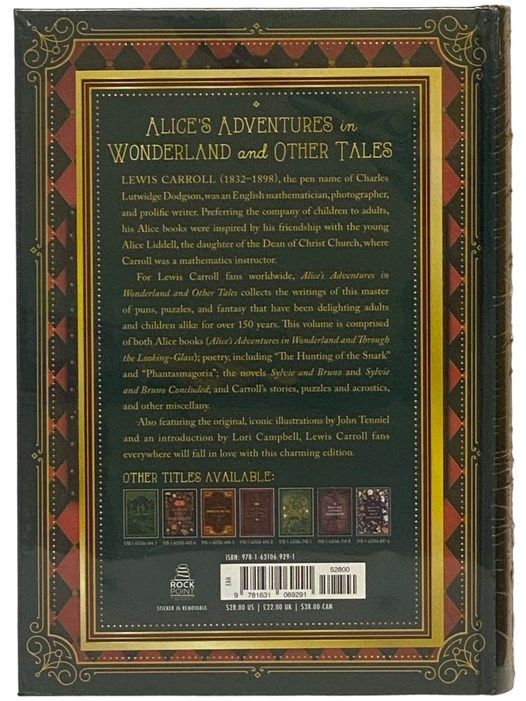 Rock Point, 2023. Hard Cover. Fine. 7x2x9. New. Still in shrink wrap. 2023 Hard Cover. 1060 pp. Delve into this stunning gift edition boasting the complete collection of Alice's Adventures in Wonderland and Other Tales and original, iconic illustrations by John Tenniel. The next elegant edition in the Timeless Classics series, Alice's Adventures in Wonderland and Other Talesis unabridged and complete, and comprised of: Both Alice books (Alice's Adventures in Wonderland and Through the Looking-Glass); The nonsense poems, including "The Hunting of the Snark" and "Jabberwocky"; The novels Sylvie and Bruno and Sylvie and Bruno Concluded; Carroll's essays and other miscellaneous writings. Also included are the original, iconic illustrations by John Tenniel and an introduction by Lori Campbell. Lewis Carroll fans worldwide will fall in love with this stunning hardcover gift edition complete with gorgeous foil cover detail, decorative endpapers, and a ribbon marker. Alice's Adventures in Wonderland and Other Tales contains every piece ever written by this master of puns, puzzles, and fantasy that have been delighting adults and children alike for over 150 years.