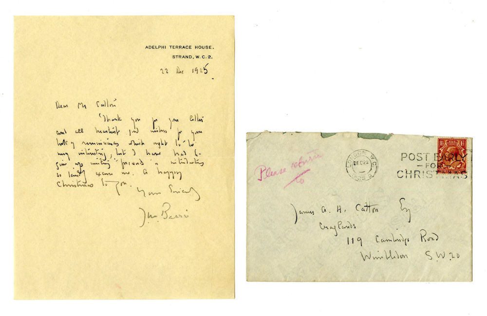 22 December 1915. Letter. Faint crease from folding. Fine. One-page handwritten letter to James A. H. Catton on 5-1/2" x 7-1/8" Adelphi Terrace House stationery SIGNED "J. M. Barrie." In full: "Thank you for your letter and all heartily good wishes for your book of reminiscences which ought to be very interesting, but I have had to give up writing ('?') as intimidating so kindly excuse me. A happy Christmas to you." With original envelope addressed in Barrie's hand. James A. H. Catton was a sports journalist respected for his writing on football (soccer) and cricket. Barrie, of course, is the creator of Peter Pan.
