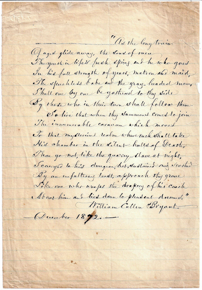 n.p., December 1872. Manuscript. Minor ink smudge to date; light wrinkling and toning. Very Good. Handwritten sixteen-line conclusion of Bryant's most famous poem and one of the best-known poems of the 19th century--"Thanatopsis"--on a 6-1/4" x 9" lined sheet of paper SIGNED "William Cullen Bryant" and dated "December 1872" at the conclusion. There are several word and a few punctuation changes from the published version. Any MANUSCRIPT excerpt of this poem, especially such a substantial one as this, is quite rare.