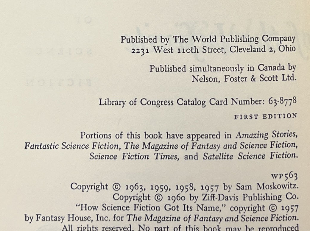 Cleveland: World Publishing Company, 1963. First Edition Thus. Hardcover. Very Good/Near Fine. Introduction by Sam Moskowitz. Very Good in an about Near Fine jacket, unclipped ($6.00), rubbed at the surface and edges. Blue cloth, rubbed to the board at the lower edge, with gilt lettering and green ink designs on the spine and front board. Square and firmly bound with a green top stain, clean internally. A collection of critical essays about foundational authors of science fiction.