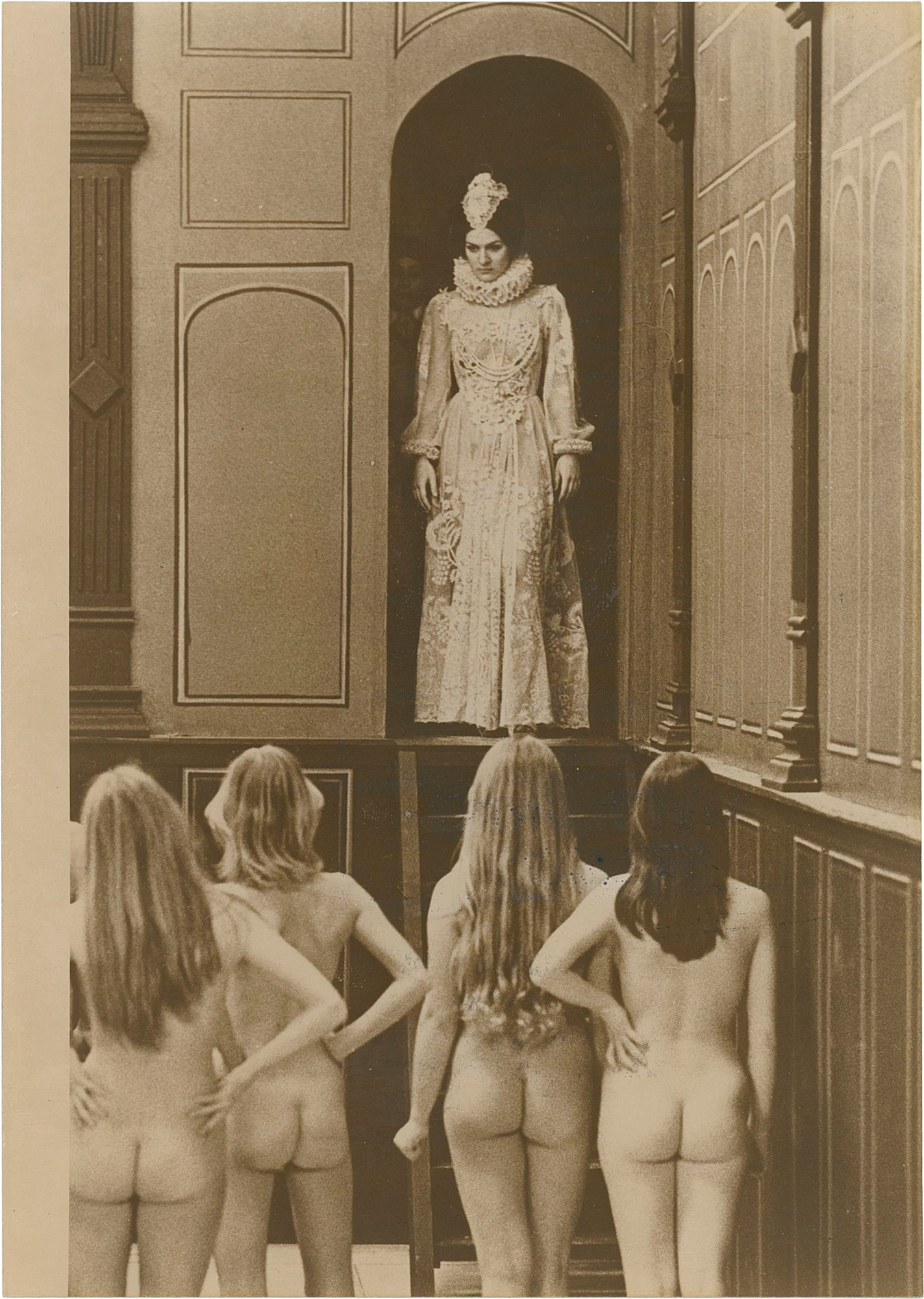 Neuilly-sur-Seine: Argos Films, 1973. Vintage borderless reference photograph from the 1973 film, showing actress Paloma Picasso, in costume as Countess Bathory, staring down at four nude women. Stamp specific to the film's French release on the verso.