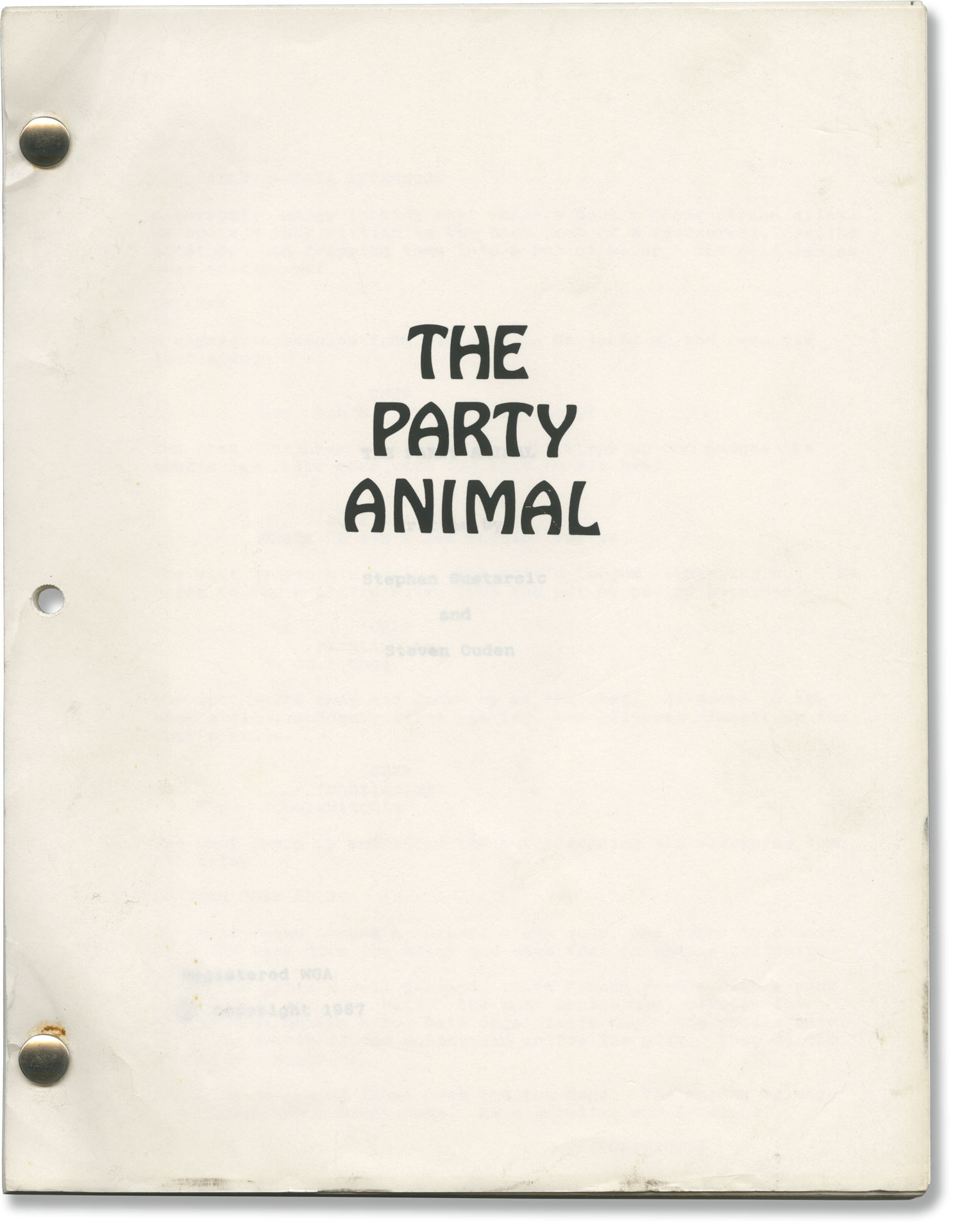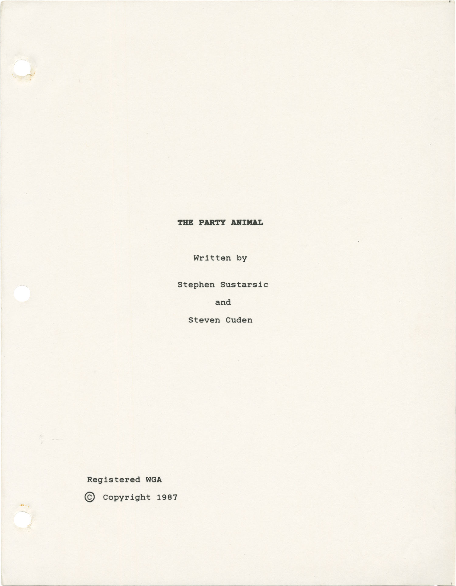 Self wrappers. Title page present, with copyright year noted as 1987, and credits for screenwriters Stephen Sustarsic and Steven Cuden. 115 leaves, with last page of text numbered 114. Xerographic duplication, rectos only. Pages Very Good plus, wrapper Very Good plus, bound with two silver brads.